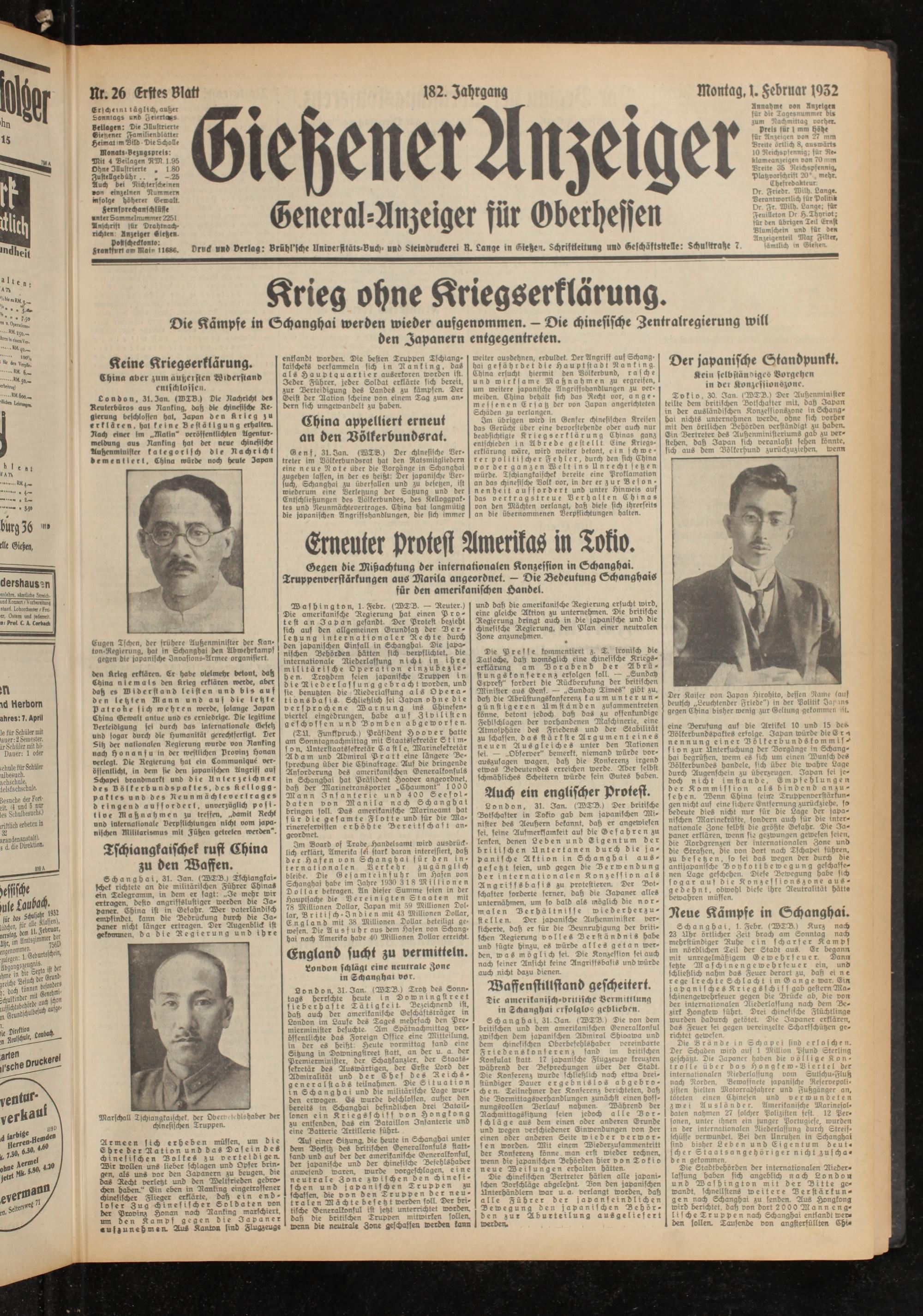 weiter ausdehnen, erduldet. Der Angriff auf Schanghai gefährdet die Haupt st a d t Nanking. China ersucht hiermit den Völkerbund, rasche und wirksame Maßnahmen zu ergreifen, um weitere japanische Angriffshandlungen zu vermeiden. China behält sich das Recht vor. angemessenen Ersatz der von Japan angerichteten Schäden zu verlangen.