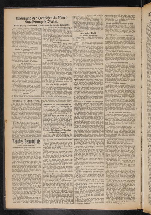 Die d e u t f ch e Lufts Portausstellung Berlin 1 932 (D e la), die zum erstenmal in diesem Umfang die Entwicklungsgeschichte der Lust« schiffahrt zeigt, rourtie in Gegenwart von etwa 1000 Ehrengästen eröffnet. Es waren Vertreter fast sämtlicher Reichs, und Staatsbehörden, der Wissenschaft und Wirtschaft, sowie zahlreiche Vertreter des diplomatischen Korps erschienen. Außerdem die bekanntesten Pioniere auf dem Gebiete der Luftschiffahrt.