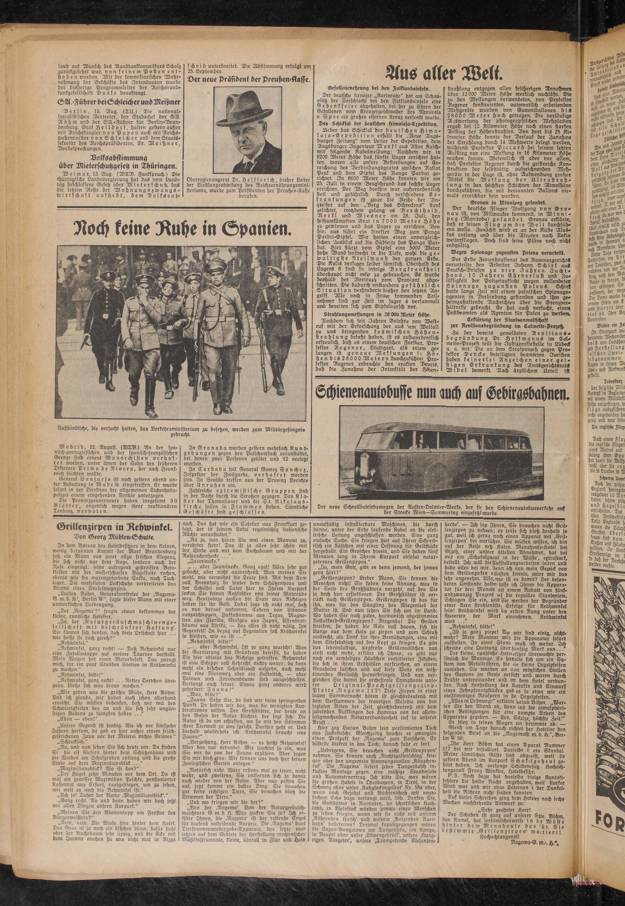 Der deutsche Flieger Wolfgang von Gronau ist, von Milwaukee kommend, in Winnipeg (Manitoba) gelandet. Gronau erklärte, daß er seinen Flug um d r e Welt durchführen wolle. Zunächst wird er an der Küste Alaskas entlang und über die Aleuten nach Tokio weiterfliegen. Doch sind seine Pläne noch nicht endgültig.
