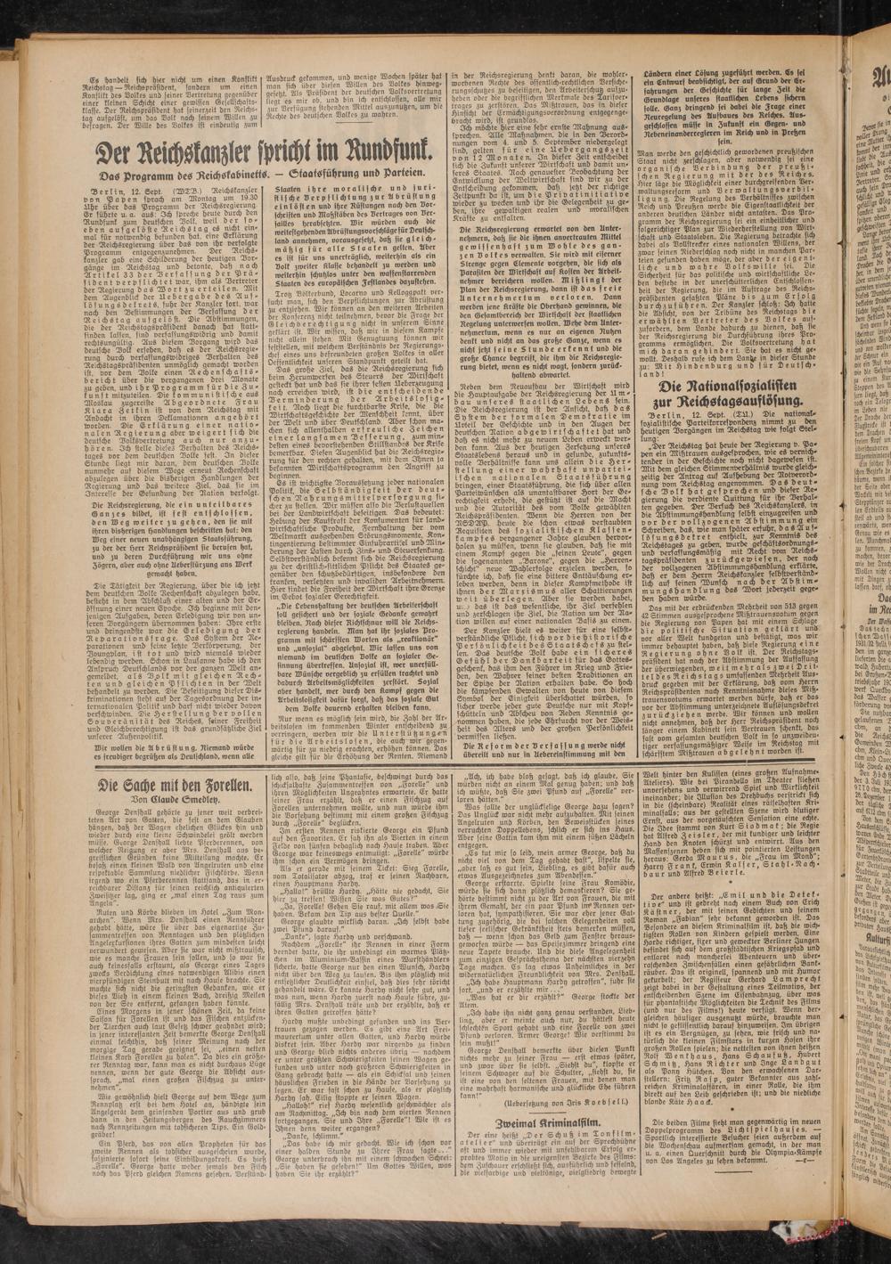 „Der Reichstag hat heute der Regierung v. Popen ein Mißtrauen ausgesprochen, tote es vernichtender in der Geschichte noch nicht dagetoesen ist. Mit dem gleichen Stimmenverhältnis wurde gleichzeitig der Antrag auf Aufhebung der Rotverordnung vom Reichstag angenommen. Das deutsche Volk hat gesprochen und dieser Regierung die verdiente Quittung für ihr Verhalten gegeben. Der Versuch des Reichskanzlers, in die Abstimmungshandlung selbst einzugreifen und vor der vollzogenen Abstimmung ein Schreiben, das, tote man später erfuhr, das Auf- lösungsdekret enthielt, zur Kenntnis des Reichstages zu geben, wurde geschäftsordnungs- und verfassungsmäßig mit Recht vom Reichs- tagspräsidenten zurückgewiesen, der nach der vollzogenen Abstimmungshandlung erklärte, daß er dem Herrn Reichskanzler selbstverständlich auf seinen Wunsch nach der Abstimmung sHandlung dos Wort jederzeit gegeben haben würde.