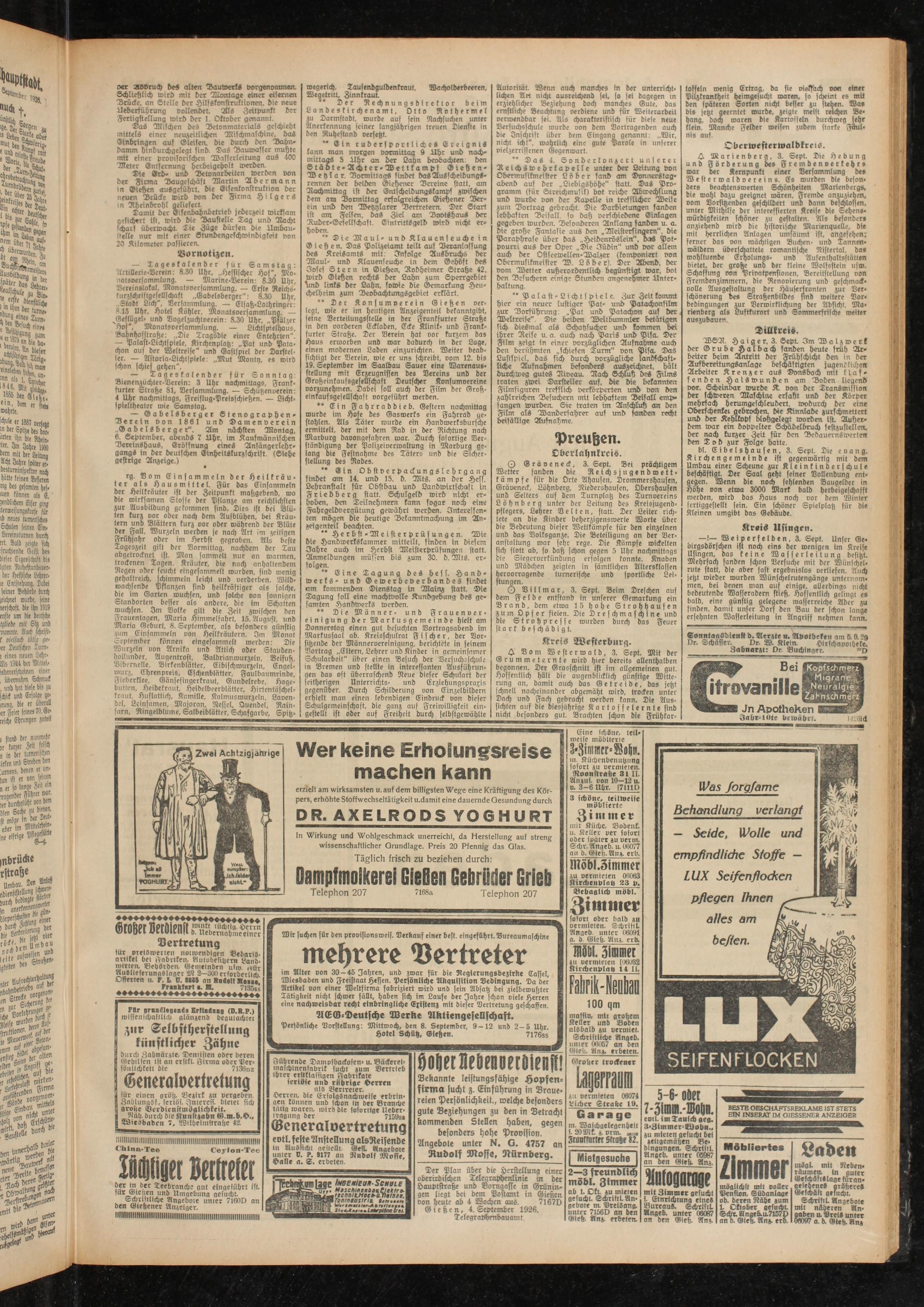 Gießen, 4. September 1926. Telegraphenbauamt.