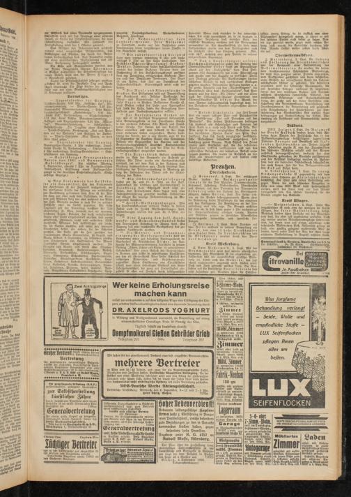 ** Der Konsumverein Gießen verlegt, wie er im heutigen Anzeigenteil bekanntgibt, seine Derteilungsstelle in der Frankfurter Straße in den vorderen Eckladen, Ecke Klinik- und Frankfurter Straße. Der Verein hat vor kurzem das Haus erworben und war dadurch in der Lage, einen modernen Laden einzurichten. Weiter beabsichtigt der Verein, wie er uns schreibt, vom 12. bis 19. September im Saalbau Sauer eine Warenausstellung mit Erzeugnissen des Vereins und der Großeinkaufsgesellschaft Deutscher Konsumvereine oorzunehmen. Dabei soll auch der Film der Großeinkaufsgesellschaft vorgeführt werden.