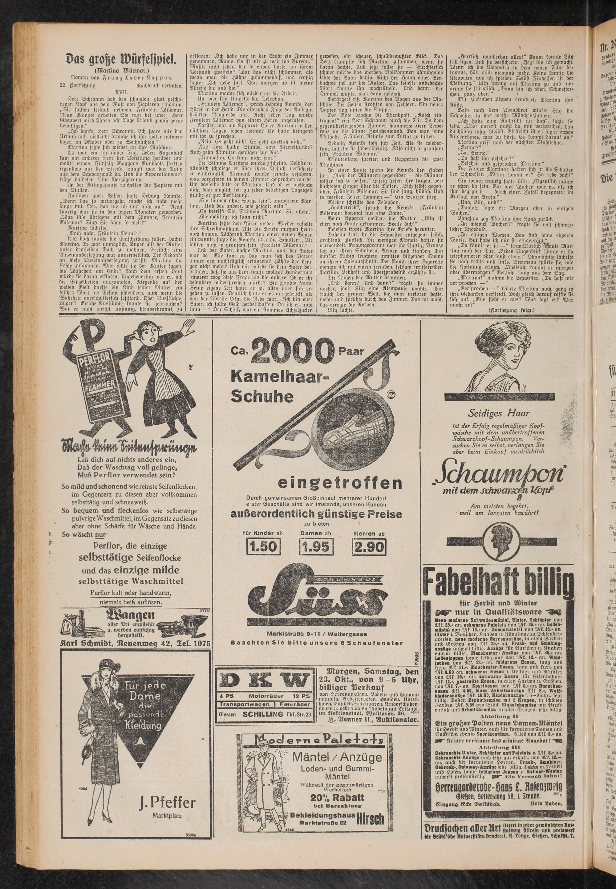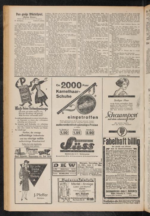 für Herost und Winter W nur in Qualitätsware Nene moderne Sctwoiloamäntel, Ulster, Schlüpfer von Mt. 25.« an, schwarte Paletots von Akk. 35.- an Lodenmäntel von Mk. Iß.- an. Gummimäntel von Ml. 16.- an, Ulster i. Burschen, Knaben u Jünglinge au Schleuder- prellen, neue moderne Herrenan?ttge, In allen Farben und Größen von '.üit 25.» an, Frack- nnd Smoking* ansftge äußerst bifltp. Anzüge für Burschen u. Knaben enorm billtn, Banobesier • Anxtiga von Mk. 35.* an, Lodenjoppen fowte feldgraue von 1UL 12.* an. Windjacken von Mk. 12.- an. feldgrane Hosen, lang und mrA, Mk 11.-, Manchester-Bosen, lang und futA, von Mk. 8.83 an, schwarxe Rosen f Kellner und Musiker von Mk. 10.- an, schwärzt Hosen für Eisenbahner Mk. 11.-, gestreute Bosen, tu allen Farben n. Gränen, von Vik. 7.- an. Sporthosen von Mk. L.- an, Burschen- Hosen Mk. 4.60, blano Arbaitsancfige Mk 8.-, Weiß- binderenztige Mk. 10.69, Kinderauzüge f. 6—9jäbr., sehr billig. Bosten Zephlrhemüen mit 2 Kragen, in schönen warben, Alk. 5.69 pro Stück. Elnsatshemden mit Brusteinsatz und Arbeitshomden tn allen Größen, sehr billig.