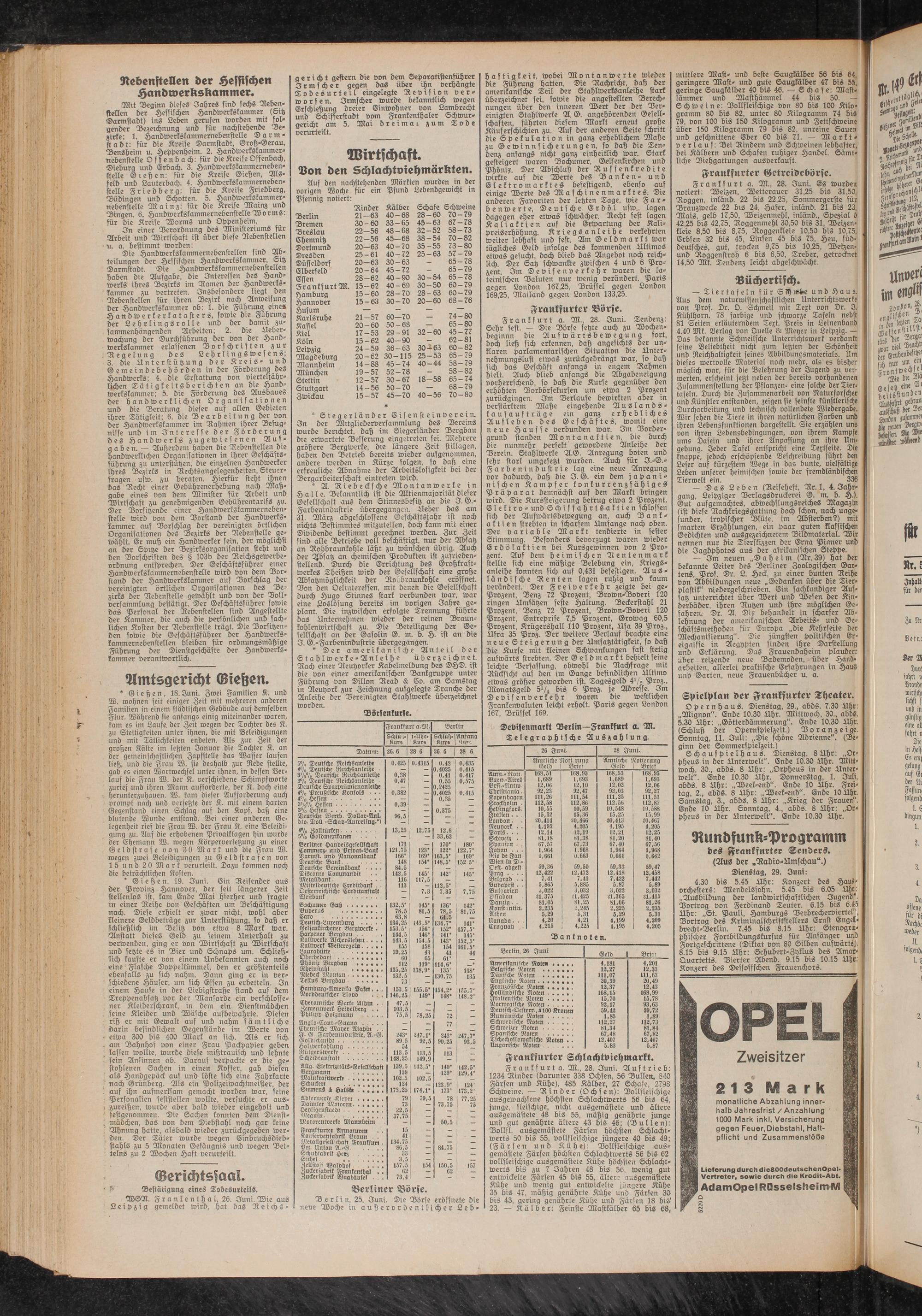 Frankfurt a. M., 28. Juni. Auftrieb: 1234 Rinder (darunter 338 Ochsen, 56 Bullen, 840 Färsen und Kühe), 485 Kälber, 27 Schafe, 2798 Schweine. — Rinder (Ochsen): Vollsleischige ausgewachsene höchsten Schlachtwerts 56 bis 64, junge, fleischige, nicht ausgemästete und ältere ausgemästete 48 bis 55, mäßig genährte junge und gut genährte ältere 43 bis 46; (Bullen): Vollst, ausgemästete Färsen höchsten Schlacht- Werts 50 bis 55, vollfleischige jüngere 40 bis 49; (Färsen und Kühe): Vollfleischige aus- gemästete Färsen höchsten Schlachtwerts 56 bis 62 vollfleischige ausgemästete Kühe höchsten Schlacht- Werts bis zu 7 Jahren 48 bis 56, wenig gut entwickelte Färsen 45 bis 55, älter: ausgemästete Kühe und wenig gut entwickelte jüngere Kühe 35 bis 47, mäßig genährte Kühe und Färsen 30 bis 43, gering genährte Kühe und Färsen 18 bis' 23. — Kälber: Feinste Mastkälber 65 bis 68,