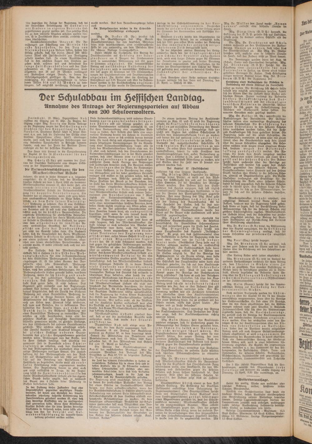 Abg. Hauck (Äatsoz.) tritt ebenfalls für entschiedene Sparmaßnahmen ein. Er fritifiert hauptsächlich die Darmstädter Lehrerversammlung und polemisiert gegen die Linke des Hauses.