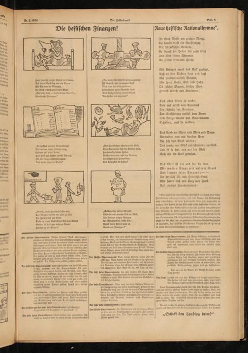 *Dies wahrhaft vaterländische Gedicht ist uns durch eine kleine Indiskretion bekanntgeworden, und wir können der Versuchung nicht widerstehen, es dem Hessenvolke schon jetzt zugänglich zu machen. Wir haben in der Elle nicht mehr feststellen können, ob Dr. Strecker oder RektorLoos oder ein Dritter der gottbegnadete Verfasser ist, hören jedoch, daß dieser bereits für den nächstjährigen Büchnerpreis vorgemerkt sei. Die Vertonung hatH e nri ch jun. übernommen, T h e s in g wird eine Bilderfolge dazu bringen,dagegen hat vr. Greinerin gewohnter kommunistischer Ruppigkeit es abgelehnt, das hessische Ministertrio Ulrich-Raab-Henrich in einer Monumentalgruppe zu verewigen.