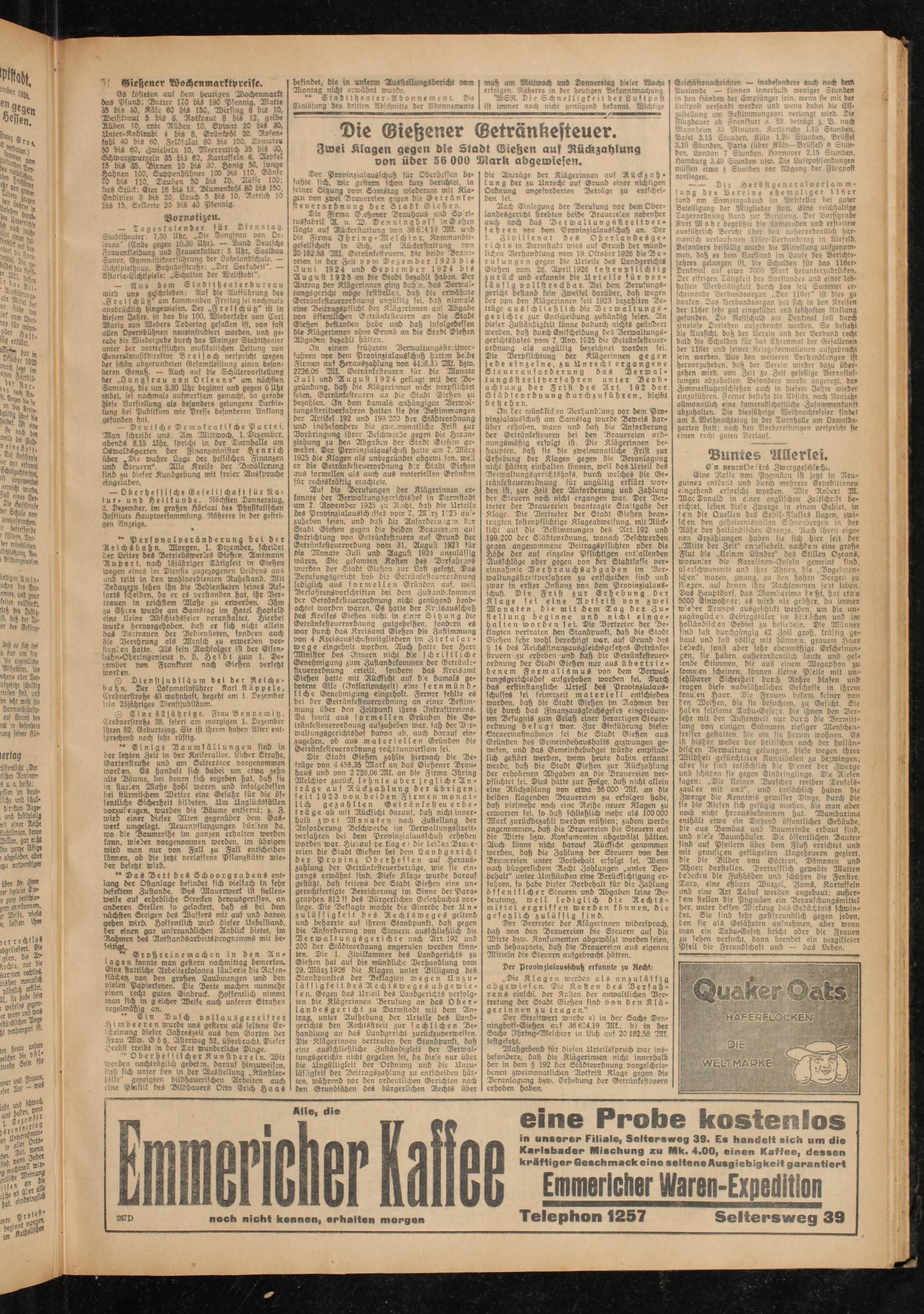 Die Stadl Gießen zahlte hiernach die Beträge von 4 458,35 Mark an das Gießener Brauhaus und von 2 726,06 Mk. an die Firma 3hring Melchior zurück, lehnte aber jeglicheAn - träge auf Rückzahlung der übrigen , seit 1 923 von beiden Firmen monatlich gezahlten Getränke st eu erbe- träge ab mit Rücksicht darauf, daß nicht innerhalb zwei Monaten nach Zustellung der Anforderung Beschwerde im Berwaltungsstreit- versahren bei Dem Provinzialausschuß erhoben worden war. Hierauf re klag e.i Die beiden Bra. e - reien die Stadt Gießen bei Dem Landgericht der Provinz Oberhessen auf Heraus- zahlung Der Getränkesteuerbeträge, wie sie eingangs erwähnt sind. Diese Klage wurde Darauf gestützt, daß seitens Der Stadt Gießen eine ungerechtfertigte Bereicherung im Sinne der Paragraphen 812 ff Des Bürgerlichen Gesetzbuches vorliege. Die Beklagte machte Die Einrede der Un- zulässigkeit des Rechtsweges geltend und beharrte auf ihrem Standpunkt, daß gegen Die Anforderung von Steuern ausschließlich Die Derwaltungsgerichte nach Art. 192 und 200 Der SlädteorDnung angerufen wer Den könnten. Die 1. Zivilkammer des LanDgerichtS zu Gießen hat auf Die münDliche BerhanDlung vom 29. März 1926 Die Klagen unter Billigung des Standpunktes der Beklagten wegen älnzu- läsf igkeit des Rechtsweges abgewie- f e n. Gegen das Urteil des Landgerichts verfolgten Die Klägerinnen Berufung an Das Ober- landesgericht zu Darmstadt mit Dem Antrag, unter Aufhebung Der Urteile des Landgerichts den Rechtsstreit zur fachlichen Behandlung an das Landgericht zurückzuverweisen. Die Klägerinnen vertraten den Standpunkt, daß eine ausschließliche Zuständigkeit Der Derwaltungsgerichte nicht gegeben sei, Da diese nur über Die Ungültigkeit der Ordnung und Die Unzu- läf'igfeit Der Beitragszahlung zu entscheiden hätten, während vor den ordentlichen Gerichten nach den Grundsätzen des bürgerlichen Rechts über