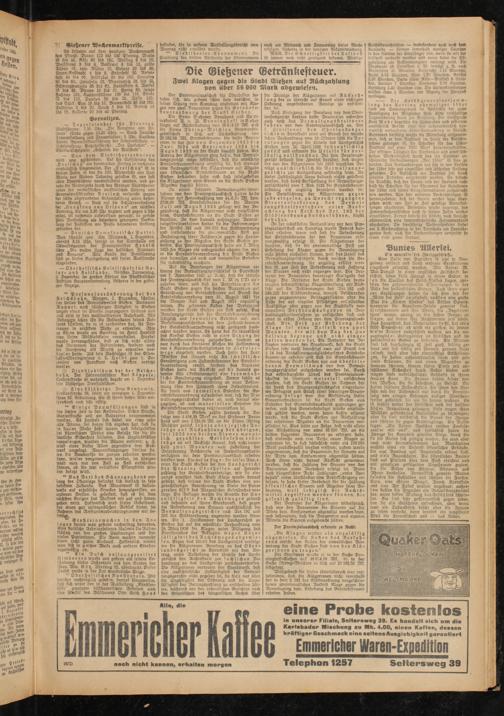 Der Provinzialausschuß für Obcrb;ffcn befaßte sich, wie gestern schon kurz berichtet, in seiner Sitzung vom Samstag wiederum mit Klagen von zwei Draucreien grgrn die Getränke- st«Verordnung der Stadl Gießen.