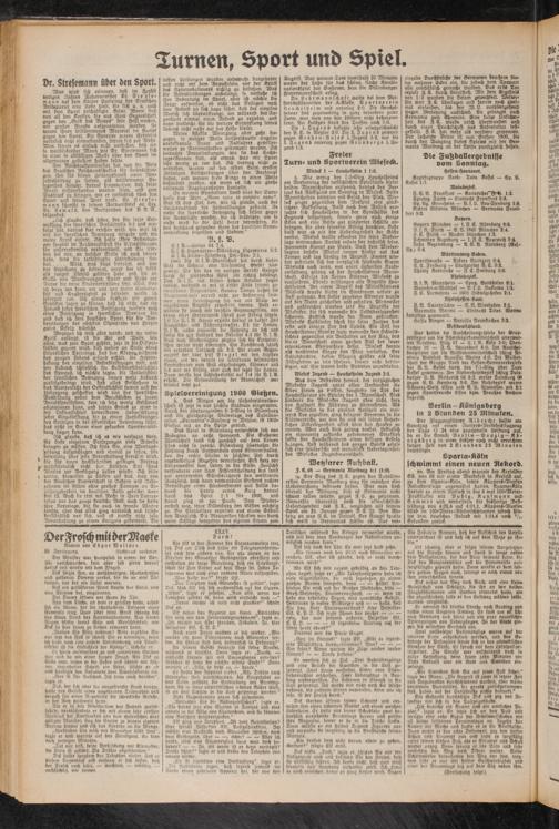 Man wird sich erinnern, daß im Herbst vorigen Jahres Außenminister Dr. Str ese - mann auf dem Kölner Parteitag der Deutschen Volkspartel eine Rede hielt, die sich u. a. auch mit dem Sport beschäftigte Seine Worte sind von all den Kreisen, die aus ihrer Gegnerschaft gegen den „(Seift des BicepS" kein Hehl machen, mit großer Freude ausgenommen worden, sie waren ihnen willkommene- Material im Kampf gegen den Sport. Die Sportler waren ihrerseits natürlich nicht einverstanden, fegten sich zur Wehr. Man konnte es einfach nicht verstehen, daß ein so weitblickender Mann wie Dr. Stresemann sich in einer so abfälligen Weise über den Sport im allgemeinen geäußert haben sollte.