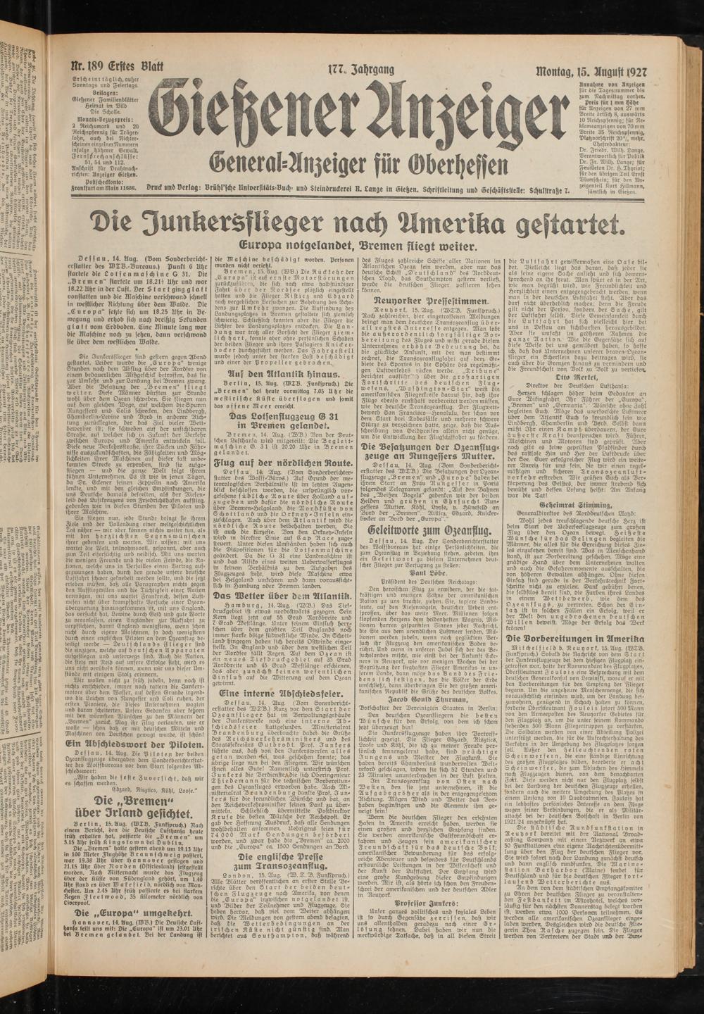 Die Junkersflugzeuge haben ihre Vortresf- lichkeit gezeigt. Die Flieger Edzard, Nisztics, Loose und Köhl, die ich zu meiner Freude persönlich kennengelernt habe, sind prächtige Jungens und Meister der Flugkunst. Sie haben bereits Ehamberlins wundervollen Weltrekord geschlagen, indem sie sich 52 Stunden und 23 Minuten ununterbrochen in der Lust hielten.