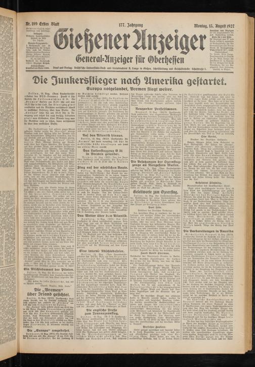 Dr. Friedr. Wich. Lange. Verantwortlich für Politik Dr. Fr. Wich. Lange; für Feuilleton Dr. H.THyriot; für den übrigen Teil Ernst Dlumschein; für den Anzeigenteil Kurt Hillmann, sämtlich in Dießen.