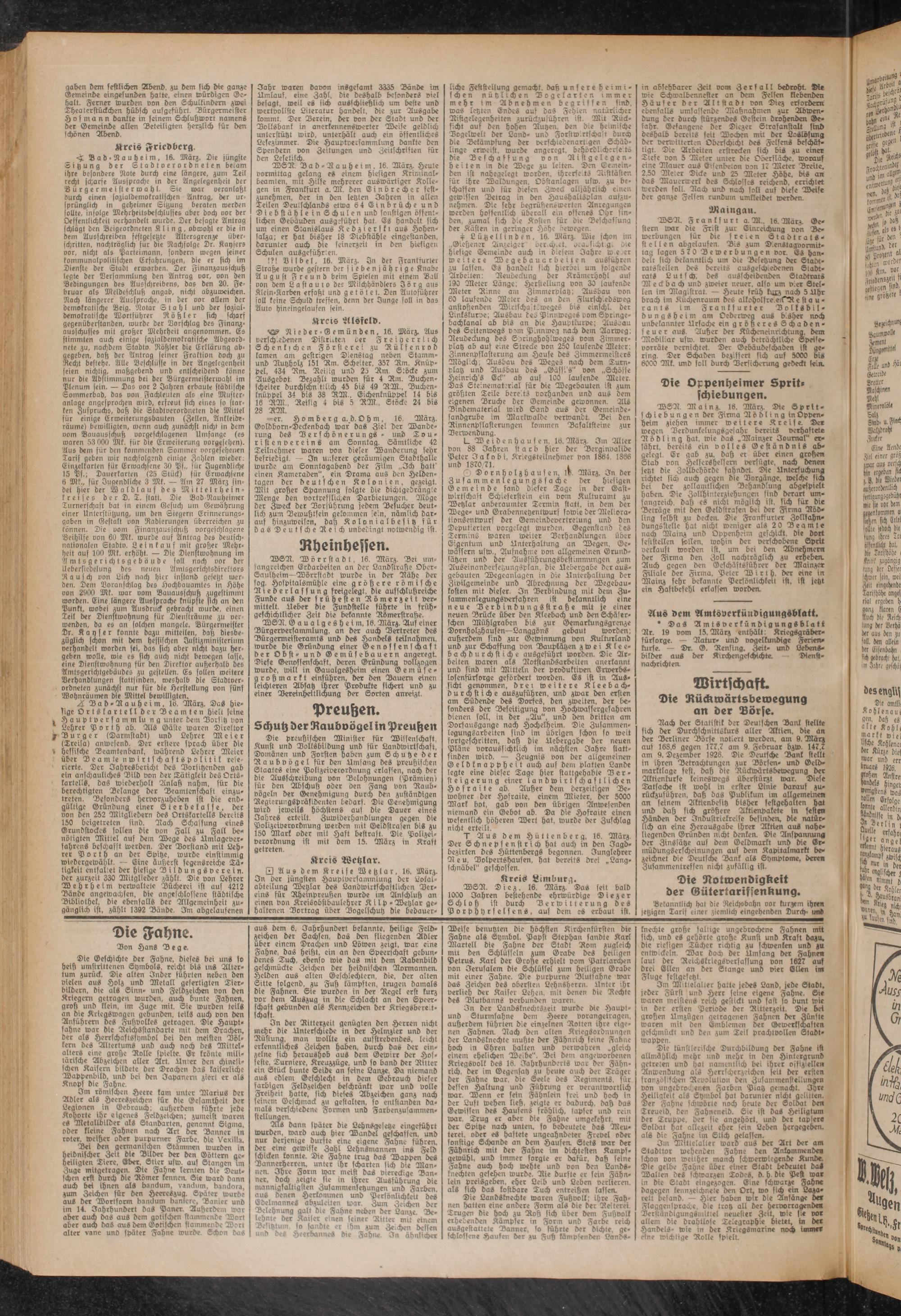 Die preußischen Minister für Wissenschaft, Kunst und Volksbildung und für Landwirtschaft, Domänen und Forsten haben zum Schutze der Raubvögel für den Umfang des preußischen Staates eine Polizei Verordnung erlassen, nach der die Ausschreibung von 'Belohnungen iPrämien) für den Abschuß oder den Fang von Raubvögeln der Genehmigung durch den zuständigen Regierungspräsidenten bedarf. Die Genehmigung wird jeweils höchstens auf die Dauer eines Jahres erteilt. Zuwiderhandlungen gegen die Polizciverorbnung werden mit Geldstrafen bis zu 150 Mark oder mit Hast bestraft. Die Polizei- Verordnung ist mit dem 15. März in Kraft getreten.