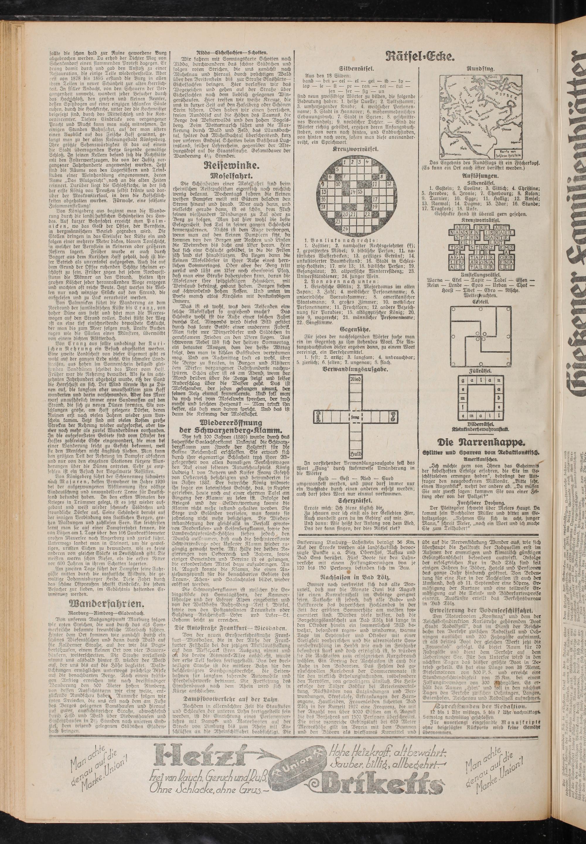 sind neun zweisilbige Wörter zu bilden, die folgende Bedeutung haben: 1. heiße Quelle: 2. Lolksstamm: 3. umherjagender Knabe: 4. weiblicher Personenname: 5. Stadt in Hannover: 6. mohammedanisches Erbauungsbuch: 7. Stadt in Syrien: 8. geschnittenes Brennholz: 9. nordischer Dichter. — Sind die Wörter richtig gebildet, ergeben deren Anfangsbuchstaben, von vorn nach hinten, und Endbuchstaben, von hinten nach vorn, sofern man diese aneinanderreiht, ein Sprichwort.