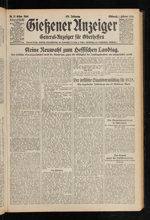 Die Einsprüche gegen die Gültigkeit der Landlagswahlen gehen aus von der Wirtschafts- Partei (Reichspartei des deutschen Mittelstandes). der Nationalsozialistischen Arbeiterpartei. Gau Hessen, und der Evangelischen Volksgemeinschaft. Die Vorstände dieser Parteien sind anwesend. Die Wirtschaftspartei ist vertreten durch Rechtsanwalt Rohde- Frankfurt, die Nationalsozialistische Arbeiterpartei durch Rechtsanwalt Dr. Frank- München und die Evangelische Volksgemeinschaft durch Pfarrer Weidner- Ober- Lais (Oberhessen). Die Interessen deS hessischen Gesamtministeriums sind vertreten durch Ministerialdirektor Dr. Schwarz und Ministerialrat Vorneman n.