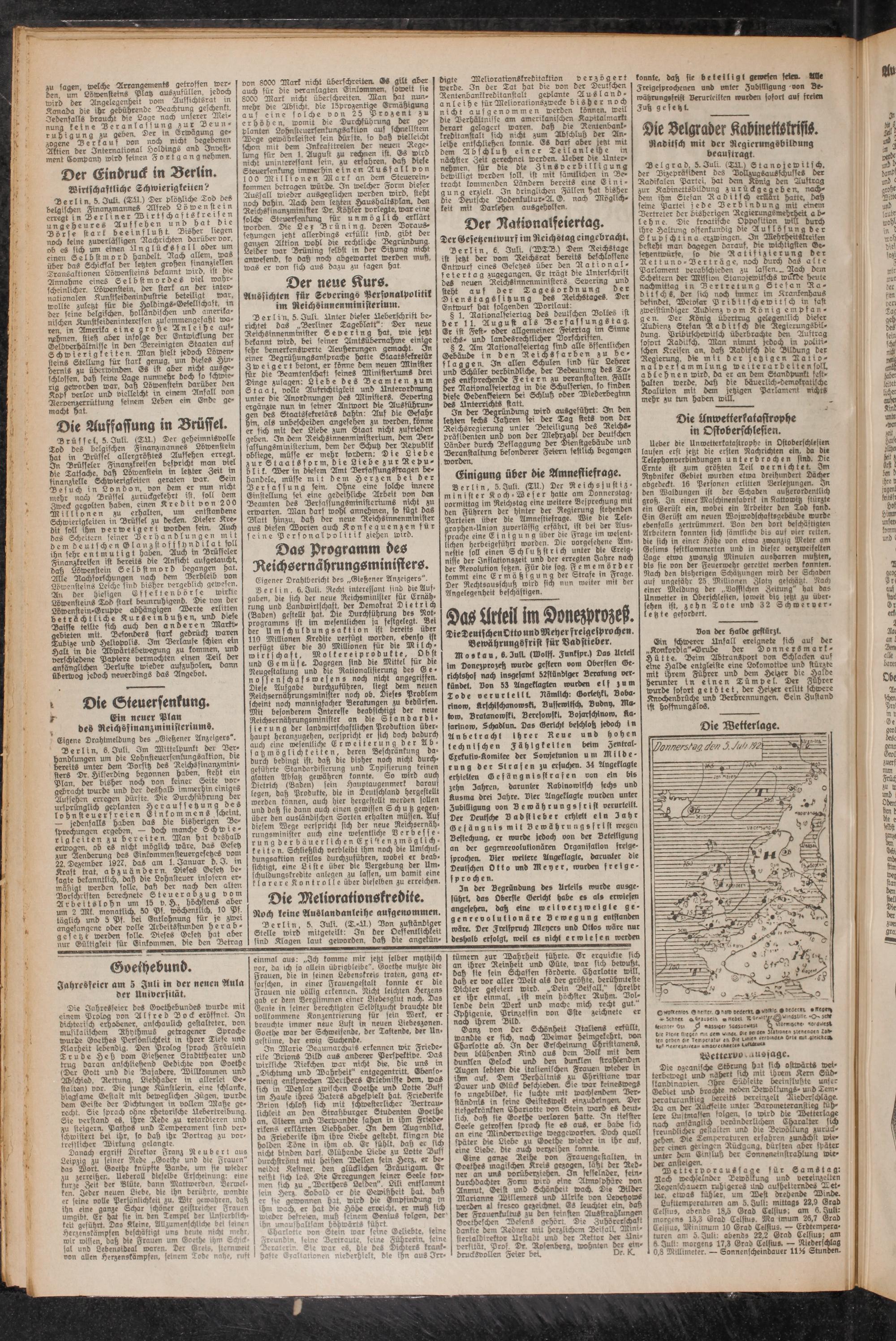 Lufttemperaturen am 5. Juli: mittags 22,9 Grad Celsius, abends 18,5 Grad Celsius: am 6. Juli: morgens 13,3 Grad Celsius. Ma imum 26,7 Grad Celsius, Minimum 10 Grad Celsius. — Erdtemperaturen am 5. Juli: abends 22,2 Grad Celsius: am 6 Jul:: morgens 17,3 Grad Celsius. — Niederschlag 0,8 Millimeter. — Sonnenscheindauer 11% Stunden.