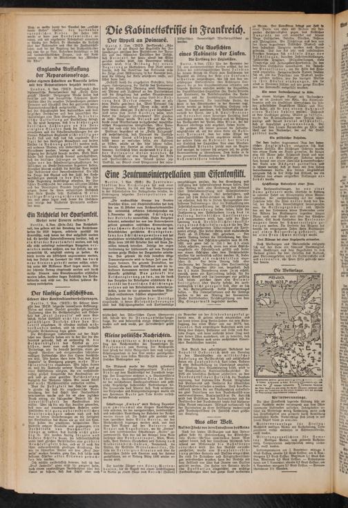 So zeichnen sich immer genauer die Zukunftsmöglichkeiten ab, auf der einen Seite ein Kabinett Poincarö, .dem der rechte Flügel der radikalsozialistischen Parckei angehören würde, auf der andern Seite ein Kabinett der Linken mit Einschluß der Sozialisten. Von einer Ministerpräsidentschaft Briands spricht man im Augen- blick weniger, da letzterer sich weigern soll, die große Verantwortung zu übernehmen. Doch dürfte er in den genannten Kombinationen das Portefeuille des Außenministers beibehalten.