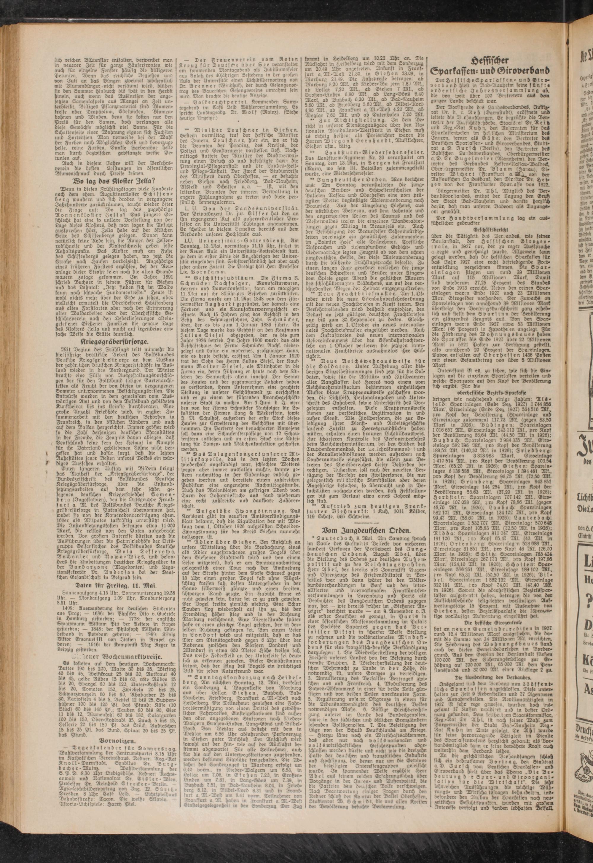 über die Tätigkeit d.s Ver andes. wie sein« Ban.a.rstalt, der Hessischen Diro-en- trale, in 1927 cor. der zu reger Aussprache a. regte und genehmigt wurde. Allgemein kann gesagt werden, daß bie hessischen Sparkassen für das Jahr 1927 eine recht befriedigende Fo t- entwicklung verzeichnen können. Die Spareinlagen stiegen um rund 39 Millionen Mark auf 115 Millionen Mark. Damit sind wiederum 27,25 Prozent des Standes von Ende 1913 erreicht. Neben den reinen Spareinlagen war n End' 1927 noch 23 Millionen Mar Girogelder vorhanden. Der Zuwachs an Spareinlagen von annähernd 39 Millionen Mark übersteigt den Vorlri gSdu^chschnitt ganz erheblich und stellt dem S P a r f i n n der Bevölkerung ein glänzendes Zeugnis auS. Von den Spareinlagen war n 6nbe 1927 etwa 53 Millionen Mar. (46 Prozent) in Hypothe en angelegt Für die Förd rung des Wohnungsbaues haben die Spar assen bis Ende 1927 üver 22 Millionen Mar in 5321 Posten zur Verfügung gestellt, also annähernd 20 Prozent der Spareinlagen. Davon entiallen auf Oberhessen 1436 Posten mit einem Gesamtbetrag von über 5 Millionen Mark.