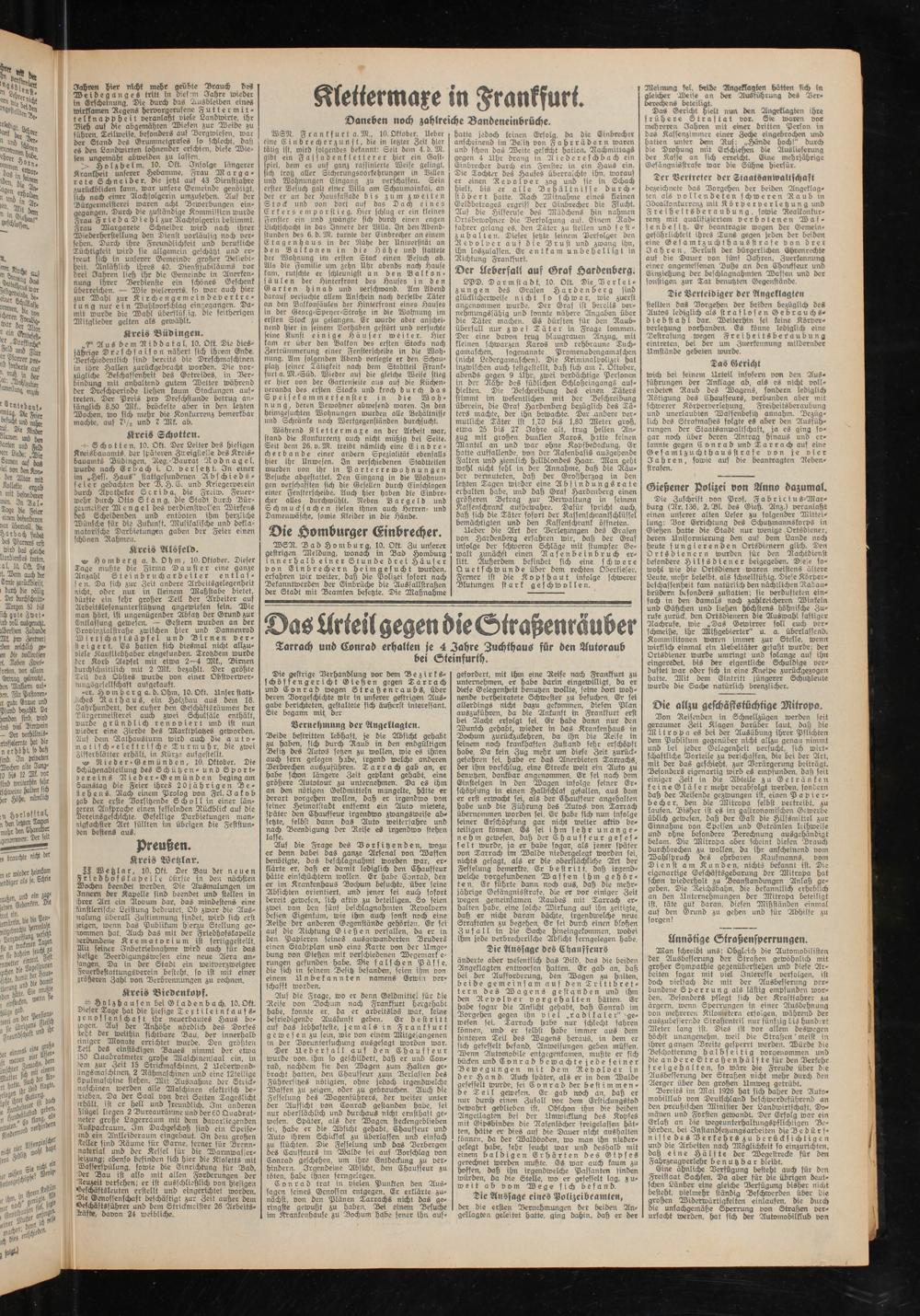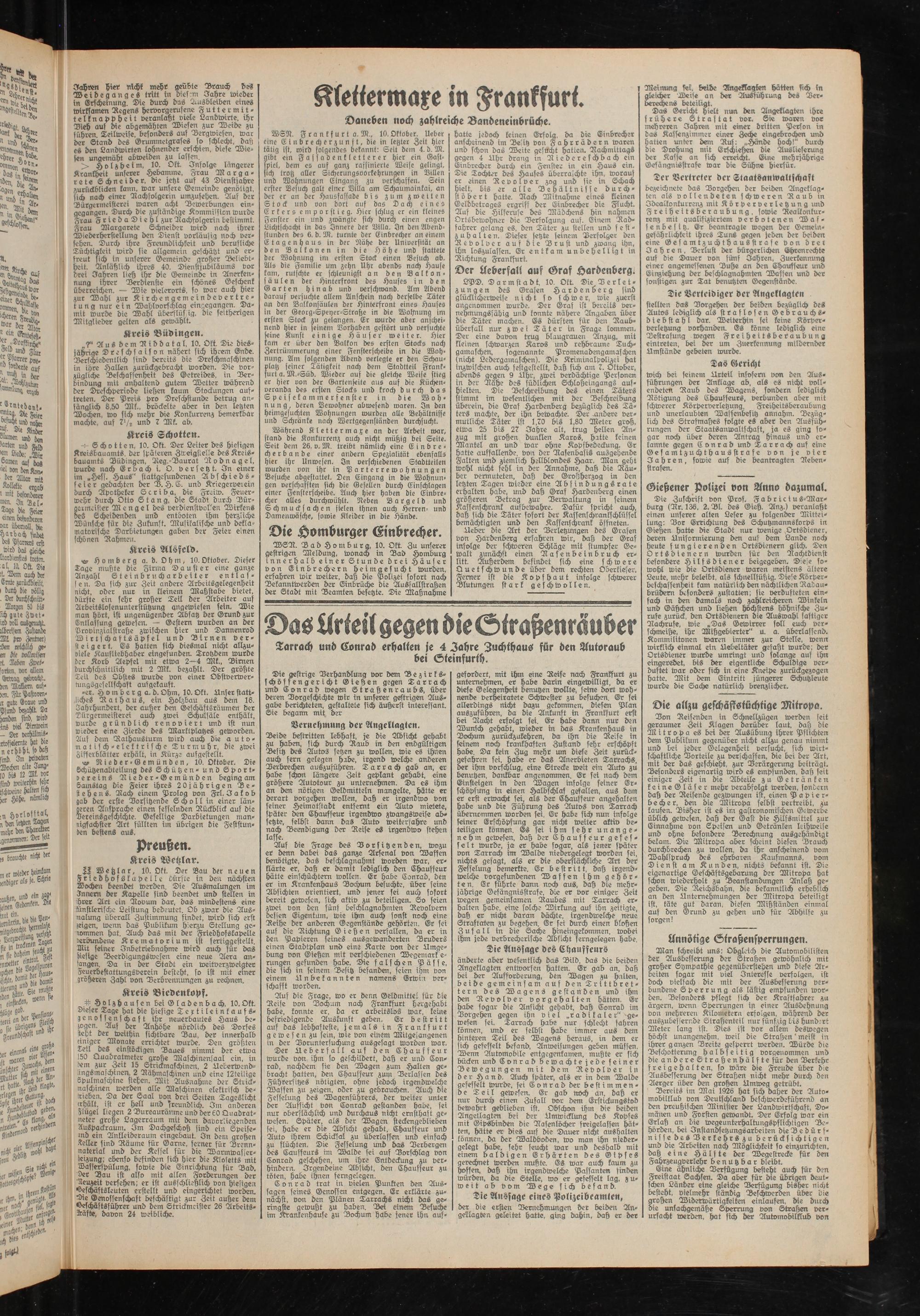 Die gestrige Verhandlung vor dem Bezirks- schöffengericht Gießen gegen Tarrach und Conrad wegen Straßenraubs, über deren Vorgeschichte wir in unserer gestrigen Ausgabe berichteten, gestaltete sich äußerst interessant. Sie begann mit der