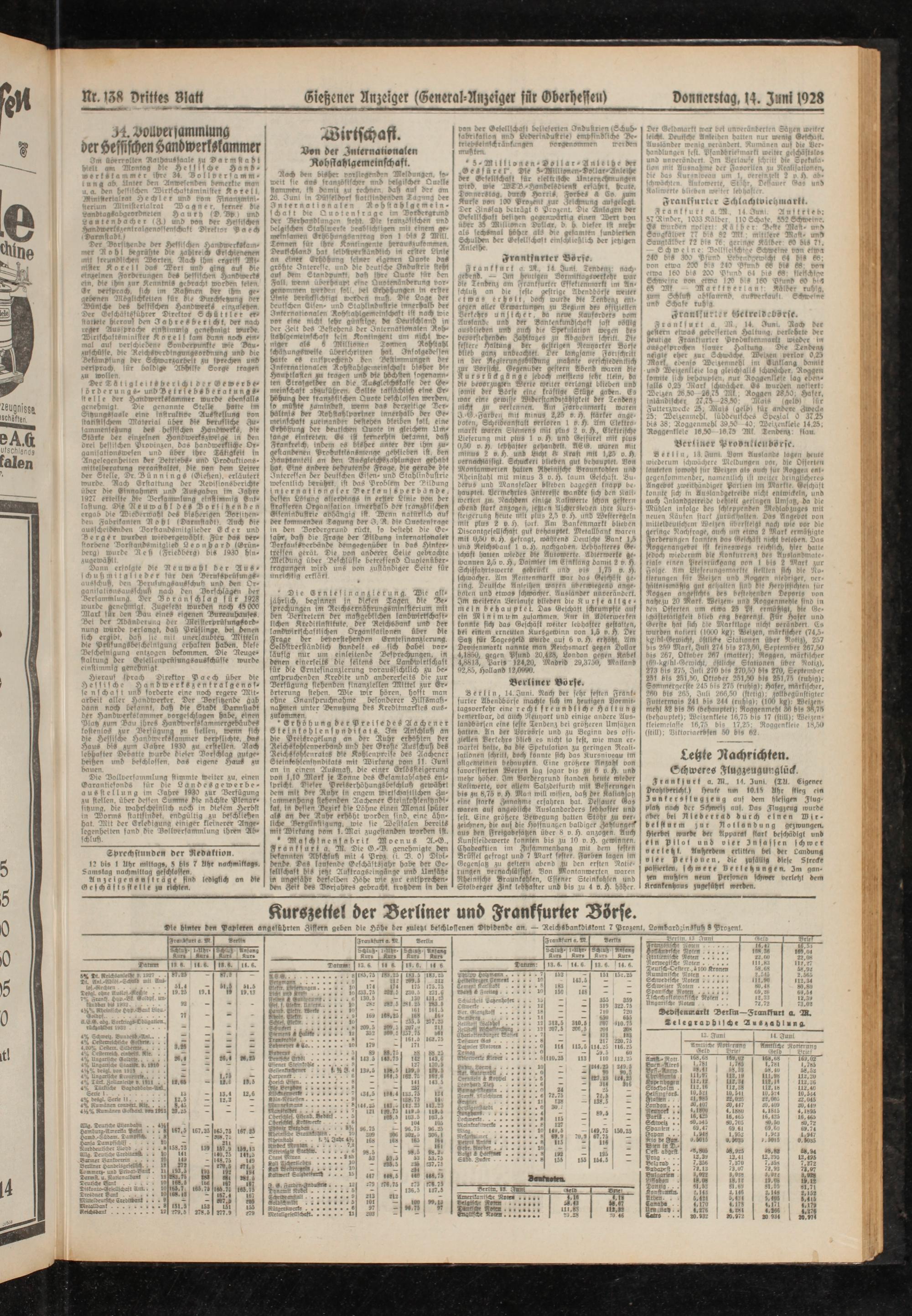 Frankfurt a. 'M., 14. Juni Tendenz: nach» lebend. — 3m heiulgen Äarmittagsoerketzr war die Tendenz am Franktutter (Fffeftenmarft tm Anschluß an die feftc gestrige flbenbbörje weiter etwa» erholt, doch wurde die Tendenz ent. gegen aller Erwartungen ;u Beginn bes offiziellen Berkehr» unsicher, bo neue Sfauforber« vom Auslands und der Banken kundschaft säst völlig ausblieben und auch die Sptfulation an gen des beoorstedenden Zahltage? zu Abgaben schritt. Die fester,- Haltung der gdtrlgen Aeuyorker Börse blieb ganz unbeachtet Der tongfame Fortschritt in der Negierung-vildung mahnte verschiedentlich zur Vorsicht. Gegenüber gestern flbcnb muren die Kursrückgänge jedoch meistens sehr klein, da die beoorzuaien Vene weuer verlangt blieben und somit der Börse eine krästtge cfüge gaben. <ks mar eine gewiße Viderstondssähigkeit der Tendenz nicht zu oerlennen. Am ifarbeitmarlt waren 3. G. jZarben, mit mmu» 2,25 o. H. stärker angeboten, Scheideanstalt verloren 1 o H Am Elektra markt waren Siemens mit plus 2 a. j)., Elektrische Lieferung mit plus 1 o H und Gesturei mit plus 0,50 o » lebhafter gel-andelt AEG waren mit minus 2 o. H. und Licht ft 51 re ft mit 1,25 o. H vernachlässigt Schucken blieben gut behauptet. Bon ‘JNontanroenen halten Aheinische Braunfohlen und Aheinstahl mit minus 3 v. S). kaum Geschäft. Bu derus und Mansfelder blieben dagegen knapp be hauptet. Vermehrte» Interesse wandte sich den Hali- werten zu. Nachdem einige >\aliniertc schon gestern abend stark anzogen, letzten Aschersleben ihre Kurssteigerung heute mit plus 2,5 n H. und Westeregeln mit plus 2 v. H. foit Am Bankenmarkt blieben Discontgesellschaft gut behauptet. Metallbank waren mit 0,50 v. j). gefragt, während Deiüsche Bank 1,5 unö Äetchsbank 1 o. ch. nachgaben. Lebhaftere» Ge Idjafi hatten wieder die Autowerke. Adierwerke gewonnen 2,5 d. H, Daimler im Einklang damit 2 v ch Schiffahrtswerte gedrückt und bi» 1,75 o. ch. schwacher. Am Rentenmarkt war ha» Geichöst gering. Deutsche Anleihen waren uherreiegeno ange- boten und etwas schwacher. Ausländer unverändert. 3m weiteren Verlaufe blieben die Kurse allgemein behauptet. Da» Geschäft schrumpfte auf ein Minimum zusammen. Bur in 21dferuierten konnte sich das Geschäft weiter lebhafter gestalten, bei einem erneuten Kursgewinn von 1,5 v. ch Der Satz für Tagesgeld wurde auf 6 o. ch erhöht Am Devisenmarkt nannte man Reichsmark gegen Dollar 4,1850, gegen Pfund 20,428, London gegen Kabel 4,8813, Paris 124,20, Madrid 29,3750, Mailand 92,85, Holland 12,0990.