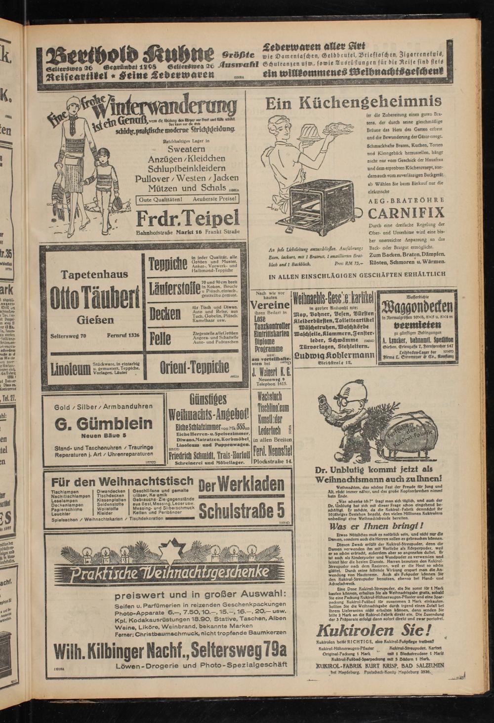 Eine Dose Kuklrol-Streupuder, die Sie sonst für t Merk kaufen können, erhalten Sie ab Weihnachtsgabe gratis, sobald Sie eine Packung Kukfrol-HOhneraugen-Pflasler und eine Spar- Packung Kukirol-Fußbad für zusammen 2 Mark einkaufen <. Sollten Sie die Welhnaditsgabe durch Irgend einen Zufall bet Ihrem Lieferanten nicht erhalten können, dann senden Sie bitte 2 Mark an die Kuklrol Fabrik direkt ein. Die Zusendung der 5 Präparate erfolgt dann sofort direkt und zwar portofrei.