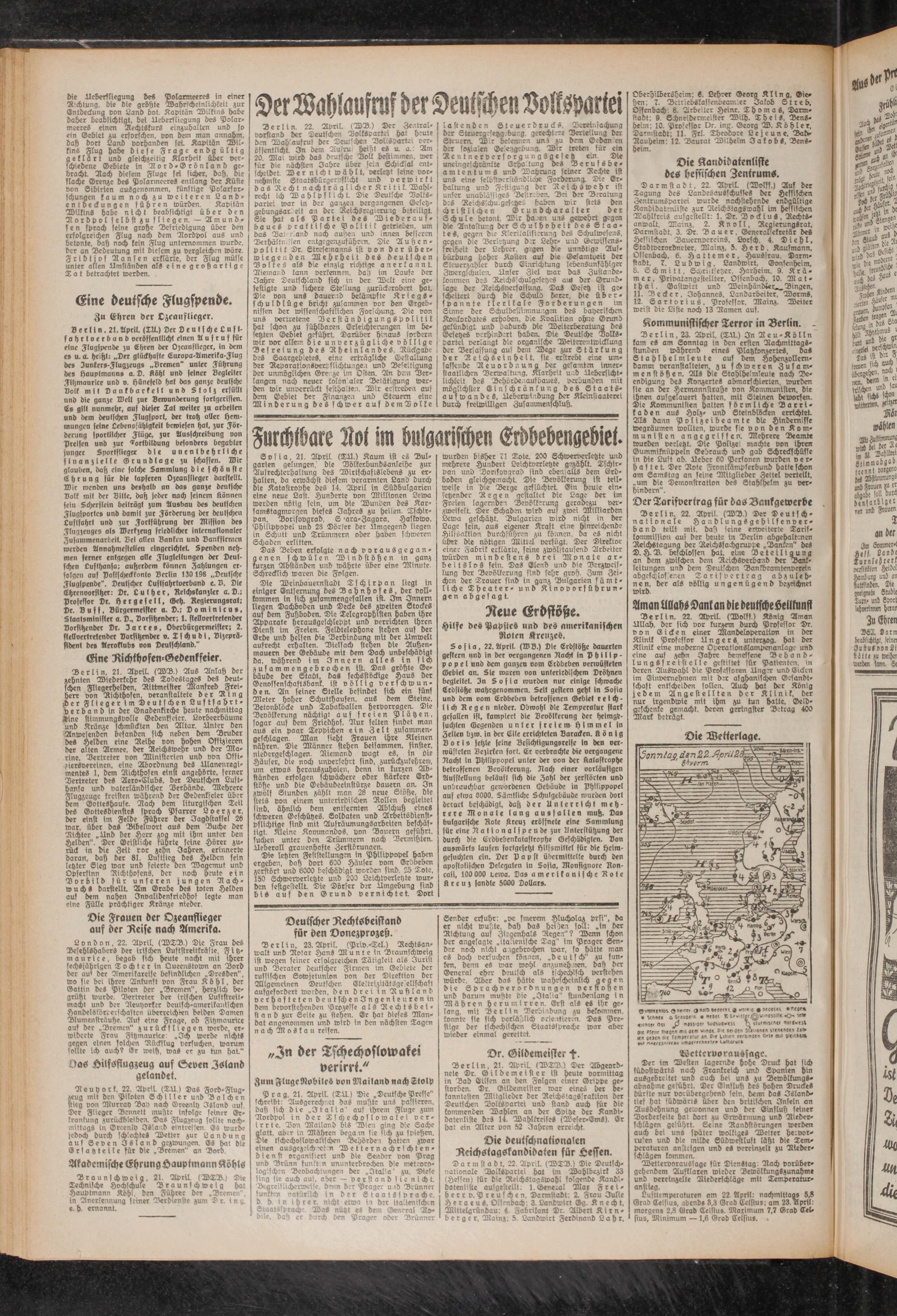 Die letzten Feststellungen in Philippopel haben ergeben, daß dort 600 Häuser vom Erdbeben zerstört und 6000 beschädigt worden sind. 25 Tote, 150 Schwerverletzte und 200 Leichtverletzte wurden festgestellt. Die Dörfer der Umgebung sind bis auf den Grund vernichtet. Dort