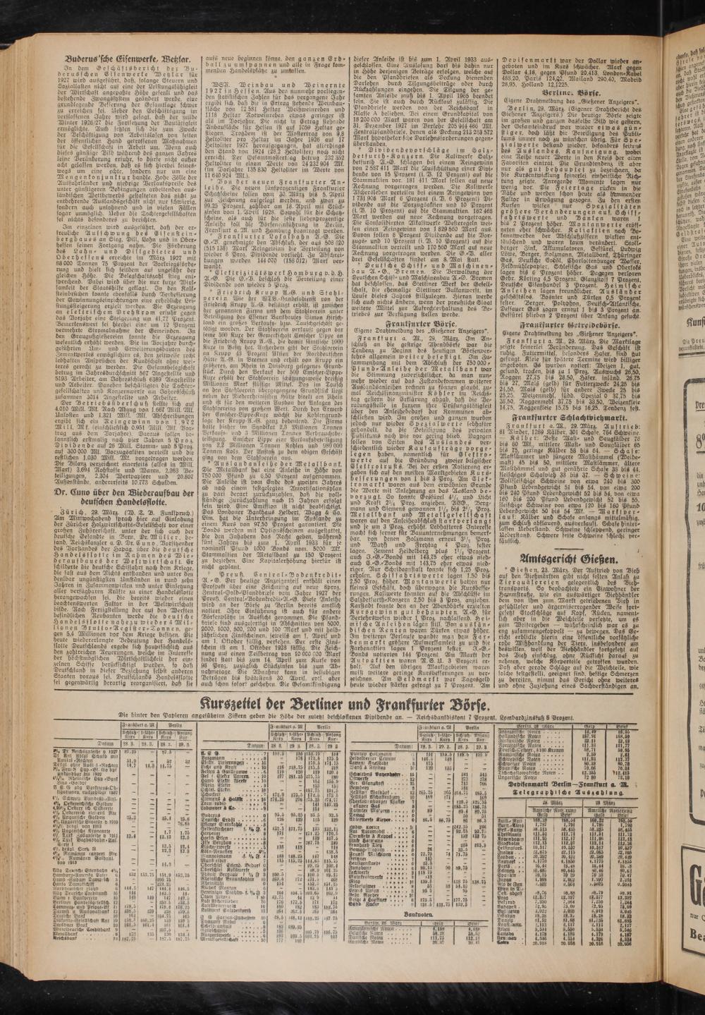 Der Betriebs Überschuß stellte sich auf 4.010 Mill. Mk. Aach Abzug von 1.667 Mill. Mk. Unkosten und 1.321 Mill. Mk. Abschreibungen ergibt sich ein Reingewinn von 1 972 Mill. Mk. (einschließlich 0.951 Mill. Mk. Vortrag aus dem Vorjahre). Daraus sollen bekanntlich erstmalig nach vier Jahren 5 Proz. Dividende auf 26 Mill. Stamm- und 5Proz. auf 300 000 Mt. Vorzugsaktien verteilt und die restlichen 1.030 Mill. Mk. vorgetragen werden. Die Bilanz verzeichnet einerseits (alles in Mill. Mark) 3.694 Rohstoffe und Waren, 2.263 Beteiligungen, 2.304 Wertpapiere und 20.807 Außenstände, andererseits 10.773 Schulden.
