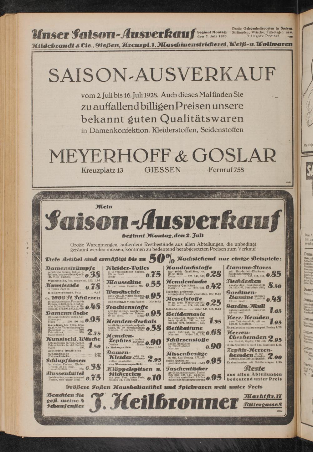 vom 2 Juli bis 16. Juli1928. Auch dieses Mal finden Sie zu auffallend billigen Preisen unsere bekannt guten Qualitätswaren in Damenkonfektion, Kleiderstoffen, Seidenstoffen