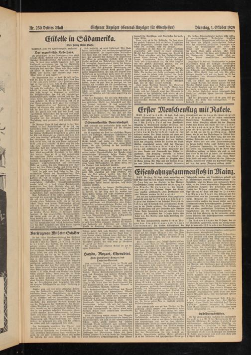 WSR. Frankfurt a.IN., 30. Sept. Rach zwei kleinen Startversuchen heute vormittag, bie beide jedoch nicht völlig glückten, gelang heute nachmittag um 3 Uhr Fritz v. Opel auf dem Frankfurter Flugplatz in Anwesenheit weniger Personen, darunter der bekannten Raketen/onstrukteur Sander, der erste Flug mit einem Flugzeug, das allein durch Raketenkraft durch die Luft befördert wurde. Der Start erfolgte auf einer metallenen Startbahn, aus der sich ein durch Raketen angetriebener Schlitten bewegte. Auf dem Schlitten stand das Flugzeug. Sobald die Raketen im Start- schlitten eingeschaltet waren, schoß das Flugzeug von der metallenen Startbahn in die höhe und entschwand tm selben Augenblick hinter einer Rauch- und Feuerwolke den Blicken der Zuschauer. Das Flugzeug umkreiste in weitem Bogen den Flugplatz und legte eine Strecke von etwa 10 Kilometer zurück, wobei die Flughöhe etwa 50 Meter betrug. Der Flug war mit starkem Brausen und Zischen der Raketen begleitet. Besonders