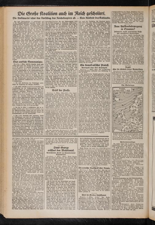 Berlin, 2. März. (Priv.-Tel.) Der fozial- demolratifche „Vorwärts" schreibt: Die Verhandlungen über die Bildung einer Großen Koalition Im Reich find gestern von der Volkspartei gesprengt worden. Der Reichskanzler wird am 13. März vor den Reichstag treten und ihm den Haushaltsvoranschlag fü*: 1929 verlegen. Das bedeutet eine Aufforderung zur sachlichen Arbeit. Falls nicht bis zum 13. März noch irgendeine Wendung cintritt, wird sich ein eigentümlicher Zustand ergeben. Die Regierung Müller-Stresemann C. r ins wird einen Etat vertreten, der von der Fraktion Slresemann- Curtius bekämpft wird. Es muß der Versuch gemacht werden, im Plenum und im Haushalts- ausschuß durchzusetzen, was bei den langwierigen Verhandlungen hinter den Kulissen nicht erreicht werden konnte: Die Verabs .Erdung eines Reichshaushaltes ohne Defizit innerhalb einer möglichst kurzen Zeit. Die Reichsrcgierung wird öfter als einmal genötigt sein, Forderungen an den Reichstag zu stellen, mit denen sie steht und fällt. Unö dann müssen die Parteien wissen, was sie zu tun haben! Die Regierung zu stürzen und eine neue an ihre Stelle zu fetzen, ist ihr gutes Recht. Aber sie müssen wissen, daß sie für das, was sie tun, vor dem Volke die Verantwortung tragen.