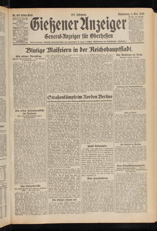Dr. Friedr. Wilh. Lange. Verantwortlich für Politik Dr. Fr. Wilh. Lange; für Feuilleton Dr.H.THyriot; für den übrigen Teil Ernst Dlumschein und für den Anzeigenteil Max Filter, sämtlich in Gießen.
