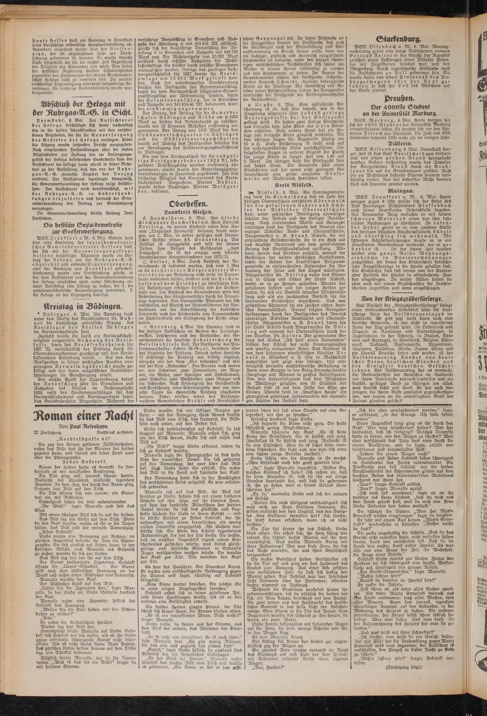 WSN.Frankfurt a.M., 6.Mai. Gestern fand hier eine Konferenz der sozialdemokratischen Gemeindevertreter Hessens statt, die sich mit der Gasvsrsorgungsfrage Hessens beschäftigte. Allgemein wurde ein Vertrag der hekoga mit der Ruhrgas-A. - G. n b g e l e h n t und entweder E igenerzeugung, oder der Gasbezug von Frankfurt gefordert. Einstimmig wurde eine Entschließung gefaßt, in der dem Aufsichtsrat und der Generalversammlung der hekoga empfohlen wird, unter Ablehnung anderer Vorschläge eine Lösuna zu suchen, die 1. die gemeinwirtscha'stliche Gasversorgung garantiert, 2. die hekoga an der Erzeugung beteiligt.
