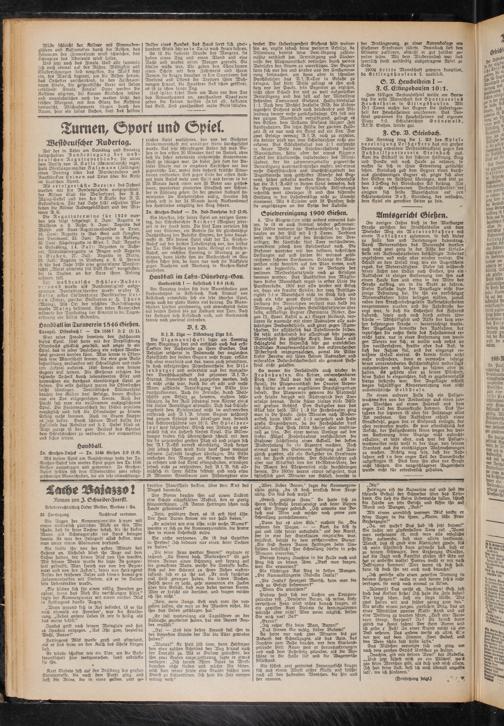 Ein schnelles, sehr faires Spiel am vorigen Sonntag, das Schiedsrichter Reichert (Wetzlar) jederzeit in der Hand hatte. Die fünf Tore verteilen sich auf vier Stürmer, ein Beweis für die gleichmäßige Durchbildung des Busecker Sturms, der seine Hauptmasse ist. Mit diesem Spiel rückt der Tv. Großen- Buseck auf den dritten Tabellenplatz vor, den seither der Tv. 1846 Gießen inne hatte. Gelingt es Großen- Buseck, am nächsten Sonntag in Marburg zu gewinnen, dann dürfte ihm die Meisterschaft im Gau Heften sicher sein, da dann nur noch die Rückspiele gegen Nauheim und Marburg in Großen-Buseck ausstehen.