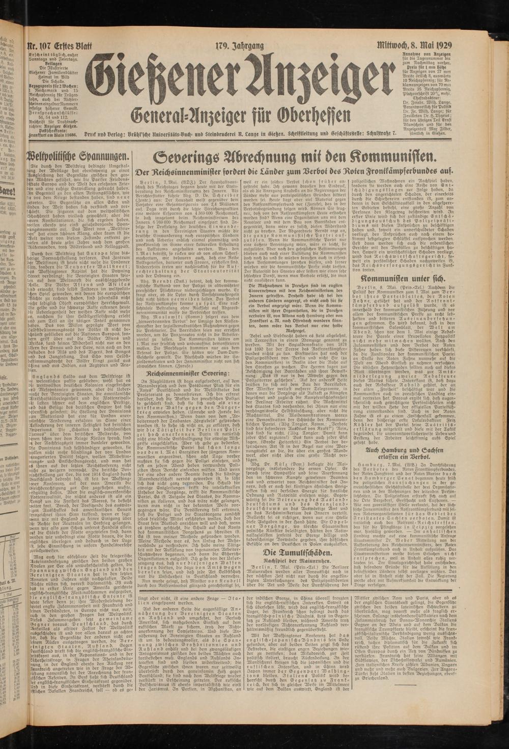 Druck und Verlag: Vrühl'fche llniverfilälr-Vuch- und Stcinöruderci N. Lange in Sietzen. Schriftlettung und Geschäftsstelle: Zchulstratze 7. sämtlich in Gießen.