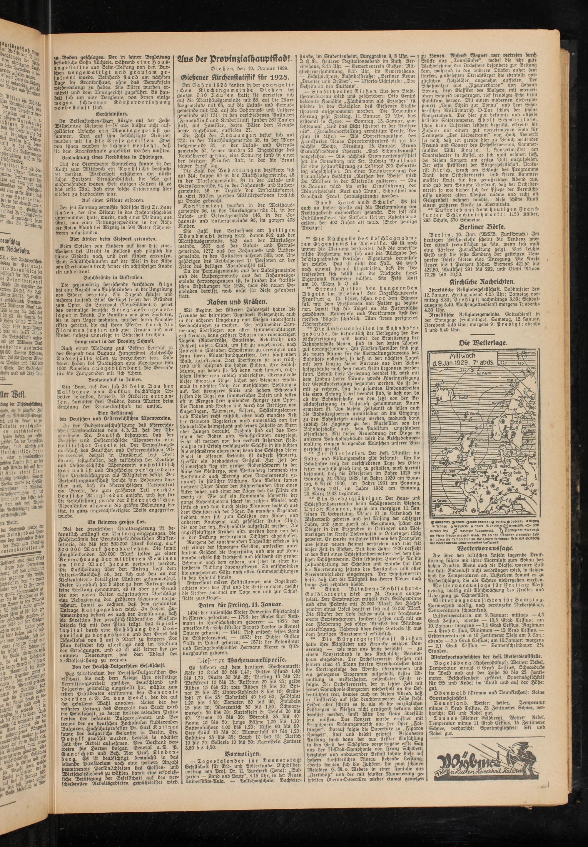 Lufttemperaturen am 9. Januar: mittags —4,3 Grad Celsius, abends — 10,5 Grad Celsius; am 10. Januar: morgens — 7,1 Grad Celsius. Maximum — 4 Grad Celsius, Minimum —12 Grad Celsius. — Erdtemperaturen in 10 Zentimeter Tiefe am 9. Jan.: abends — 2,5 Grad Celsius; am lOLanuar: morgens — 2,1 Grad Celsius. — Sonnenscheinbauer 2% Stunden.