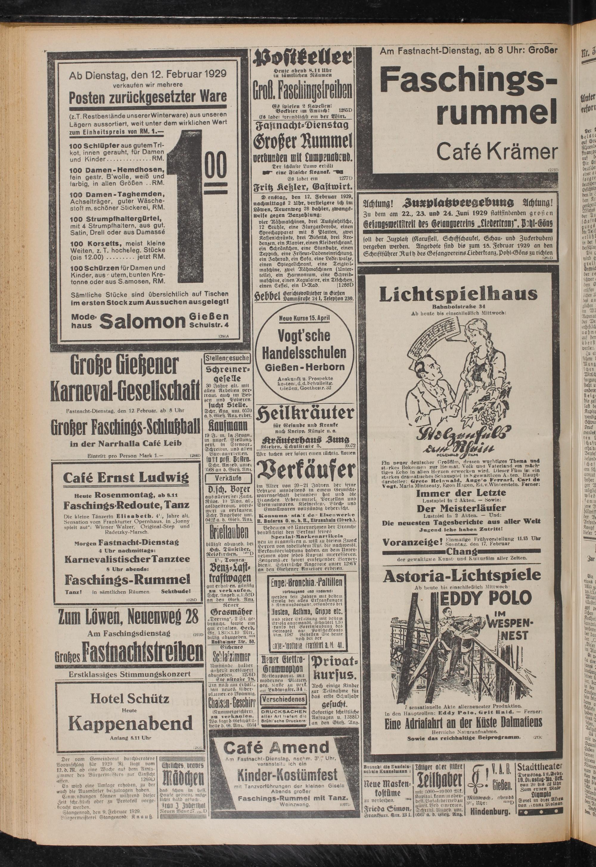Ab Dienstag, den 12. Februar 1929