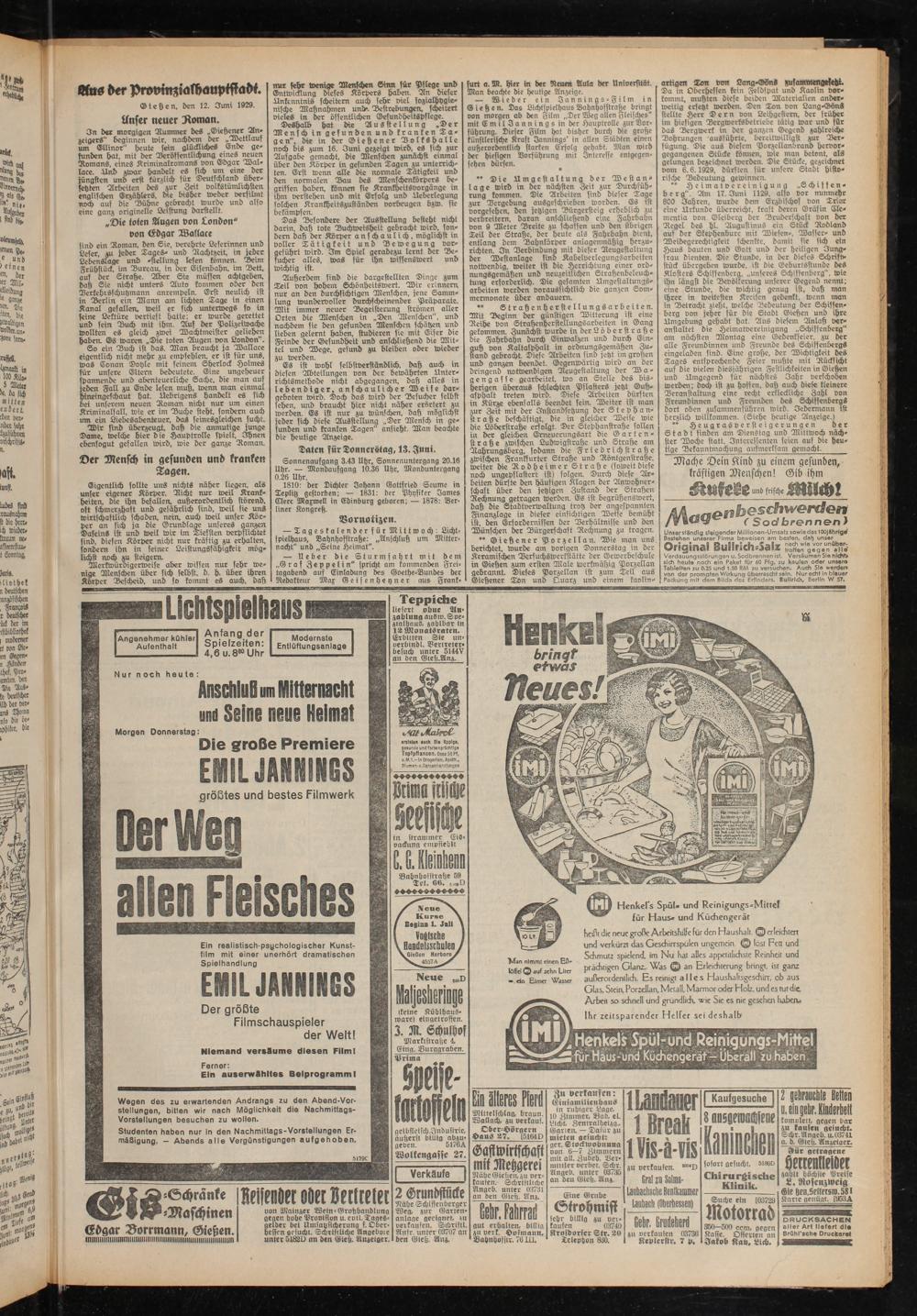 — Wieder ein Ja n n i n g s - F i l m in Gießen. Das Lichtspielhaus Bahnhofstraße bringt von morgen ab den Film „Der Weg allen Fleisches" mit EmilIannings in der Hauptrolle zur Vorführung. Dieser Film hat bisher durch die große künstlerische Kraft Iannings' in allen Städten einen außerordentlich starken Erfolg gehabt. Man wird der hiesigen Vorführung mit Interesse entgegensetzen dürfen.