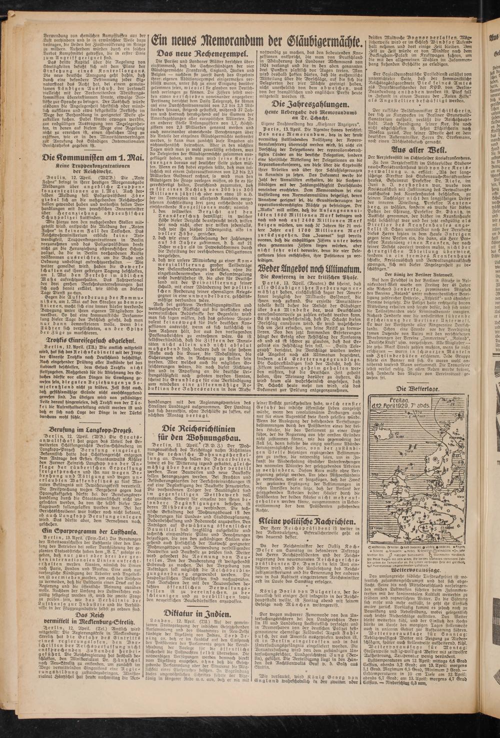 Lufttemperaturen am 12. April: mittags 6,6 Grad Celsius, abends 5,2 Grad; am 13. April: morgens 5,1 Grad. Maximum 6,5 Grad, Minimum 2 Grad. — Erdtemperaturen in 10 cm Tiefe am 12. April: abends 6,7 Grad; am 13. April: morgens 4,7 Grad Celsius. — Niederschlag 0,3 nun,