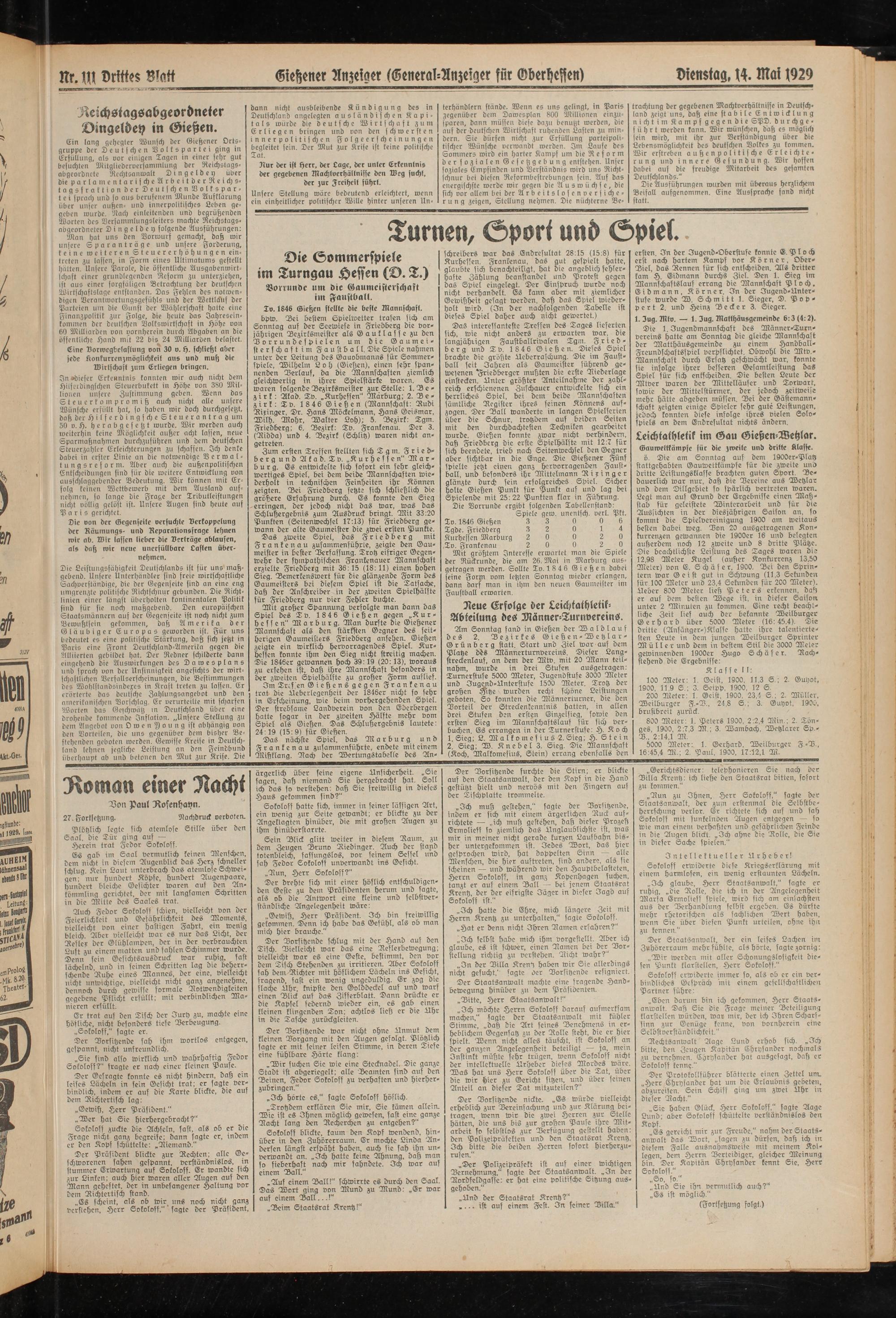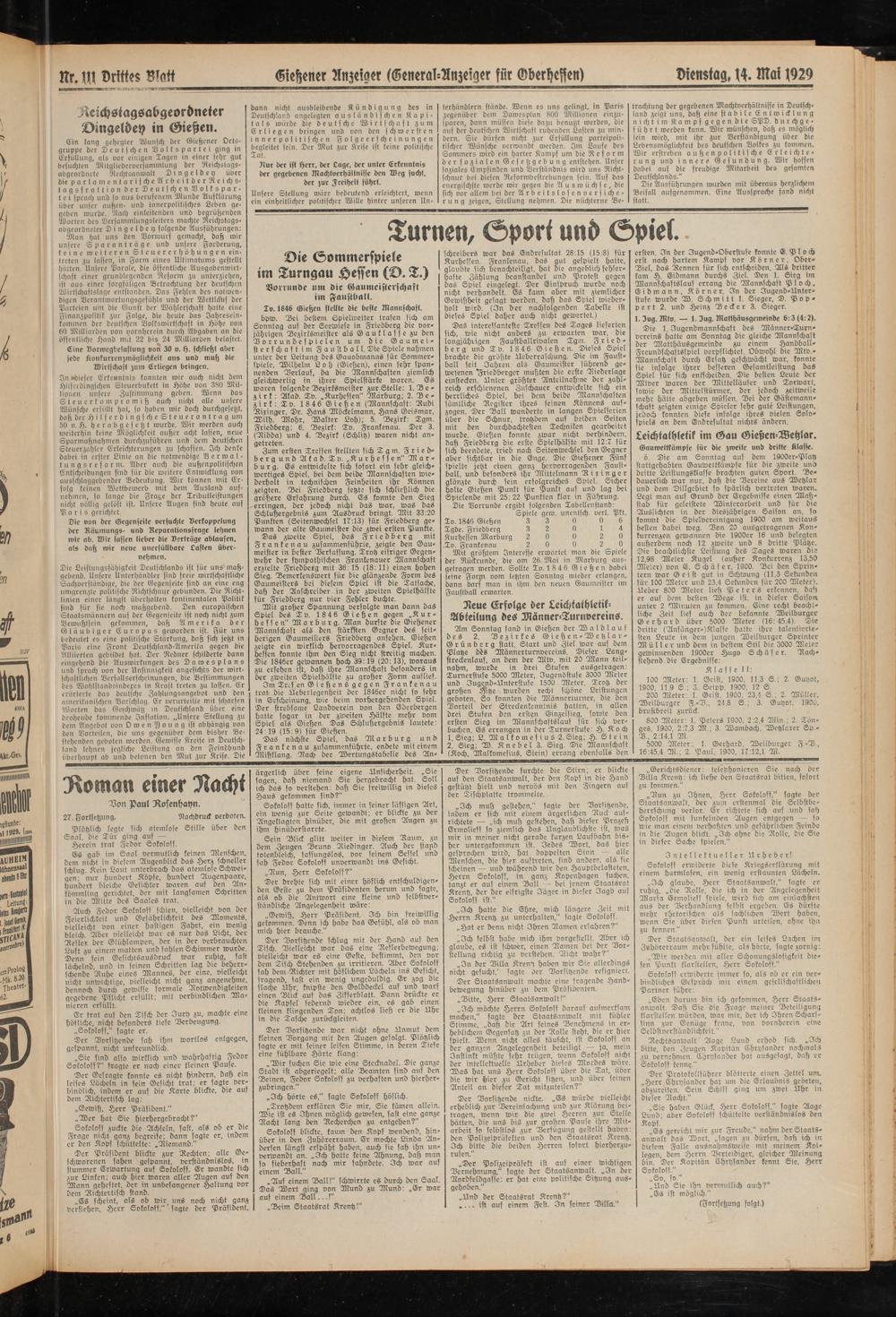 o. Die am Sonntag auf dem 1900er-Platz stattgehabten Gauwettkämpfe für die zweite und dritte Leistungsklasse brachten guten Sport. Bedauerlich war nur, daß die Vereine aus Wetzlar und dem Dillgebiet so spärlich vertreten waren. Legt man auf Grund der Ergebnisse einen Maßstab für geleistete Winterarbeit und für die Aussichten in der diesjährigen Saison an, so kommt die Spielvereinigung 1900 am weitaus besten dabei weg. Von 20 ausgetragenen Konkurrenzen gewannen die 1900er 16 und belegten außerdem noch 12 zweite und 8 dritte Plätze. Die beachtlichste Leistung des Tages waren die 12,98 Meter Kugel (außer Konkurrenz 13,50 Meter) von E. Schäfer, 1900. Bei den Sprintern war Geist gut in Schwung (11,3 Sekunden für 100 Meter und 23,4 Sekunden für 200 Meter). Heber 800 Meter ließ Peters erkennen, daß er auf dem besten Wege ist, in dieser Saison, unter 2 Minuten zu kommen. Eine recht beachtliche Zeit lies auch der bekannte Weilburger Gerhard über 5000 Meter (16:45.4). Die dritte (Anfänger-)Klasse hatte ihre talentiertesten Leute in dem jungen Weilburger Sprinter Müller und dem in bestem Stil die 3000 Meter gewinnenden 1900er Hugo Schäfer. Rachstehend die Ergebnisse:
