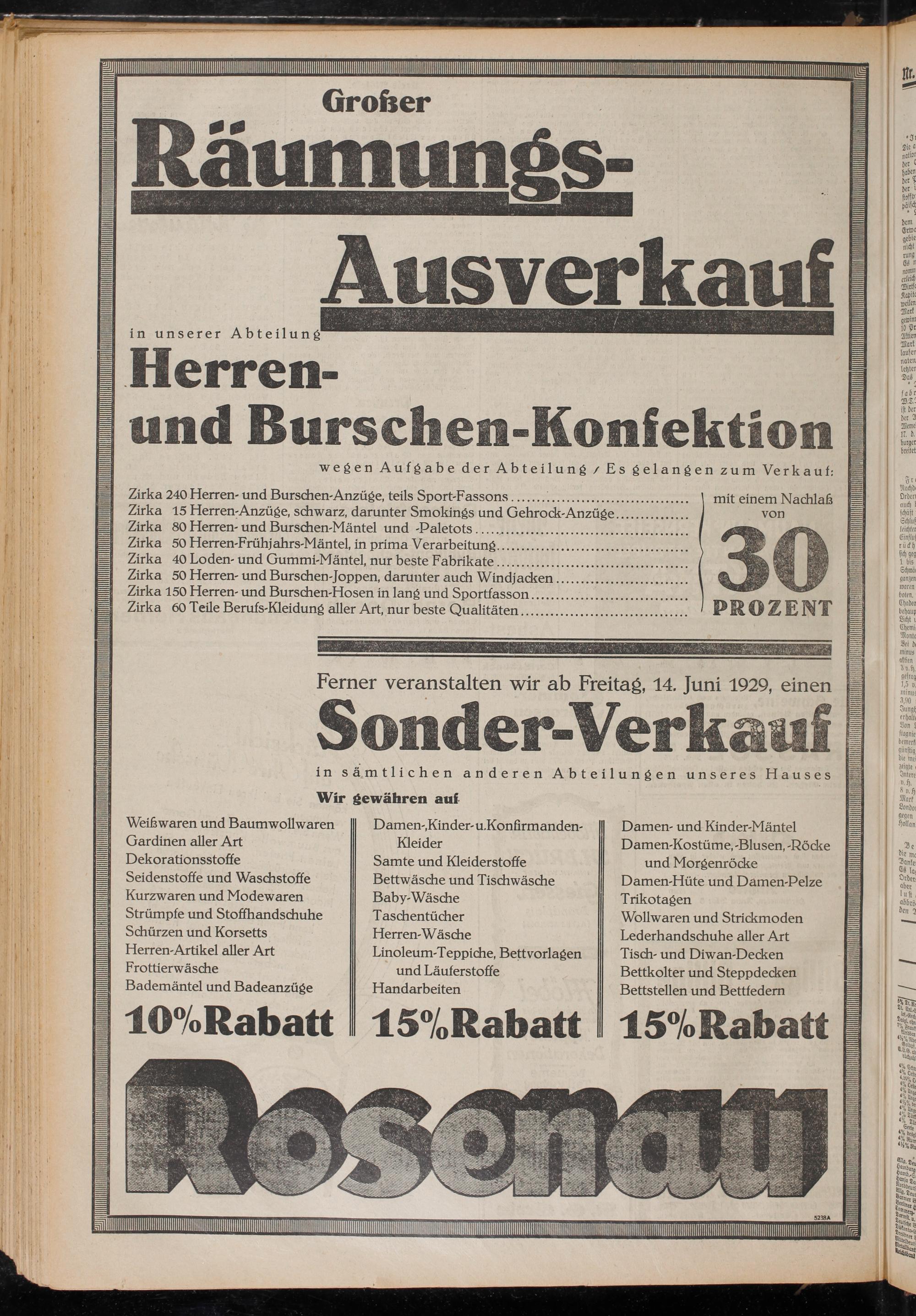 Sonder-Verkauf in sämtlichen anderen Abteilungen unseres Hauses Wir gewähren auf