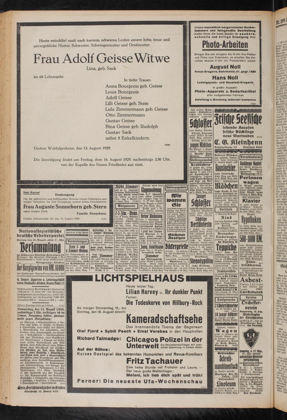 Die Beerdigung findet am Freitag, dem 16. August 1929, nachmittags 2.30 Uhr,