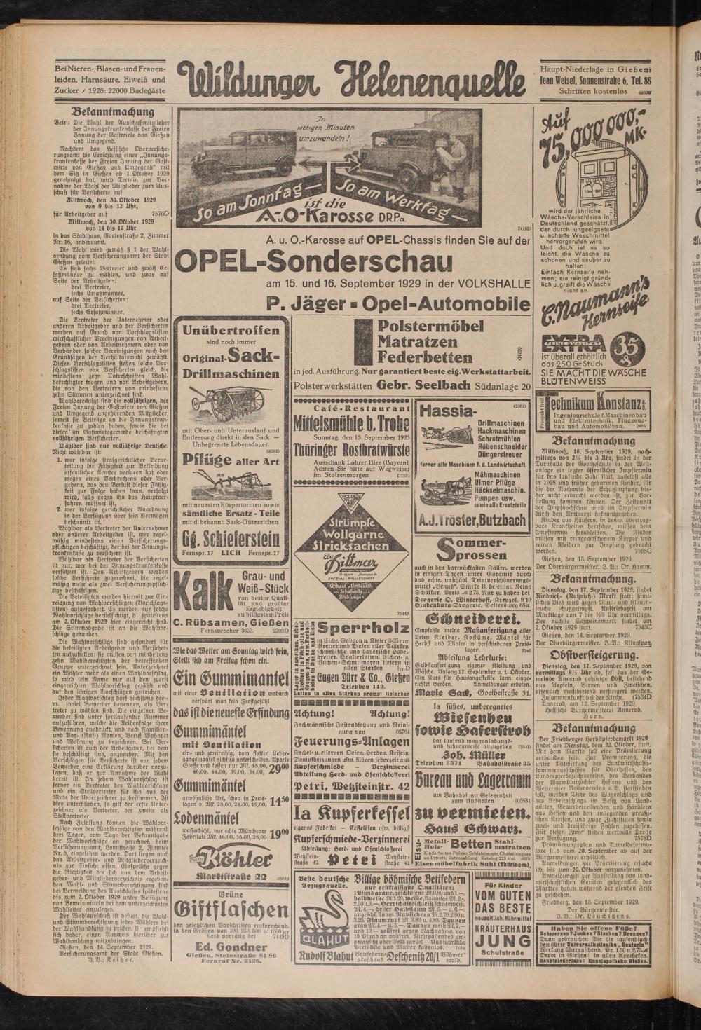 Dienstag, den 17. September 1929, findet Rindvieh- (Ruhvieh-) Markt statt, sämtliches Vieh wird gegen Maul- und Klauenseuche schutzgeimpst. Auftriebszeit am Markttage von 7 bis %9 Uhr vormittags. Der nächste Schweinemarkt findet am 2. Oktober 1929 statt. 7543C