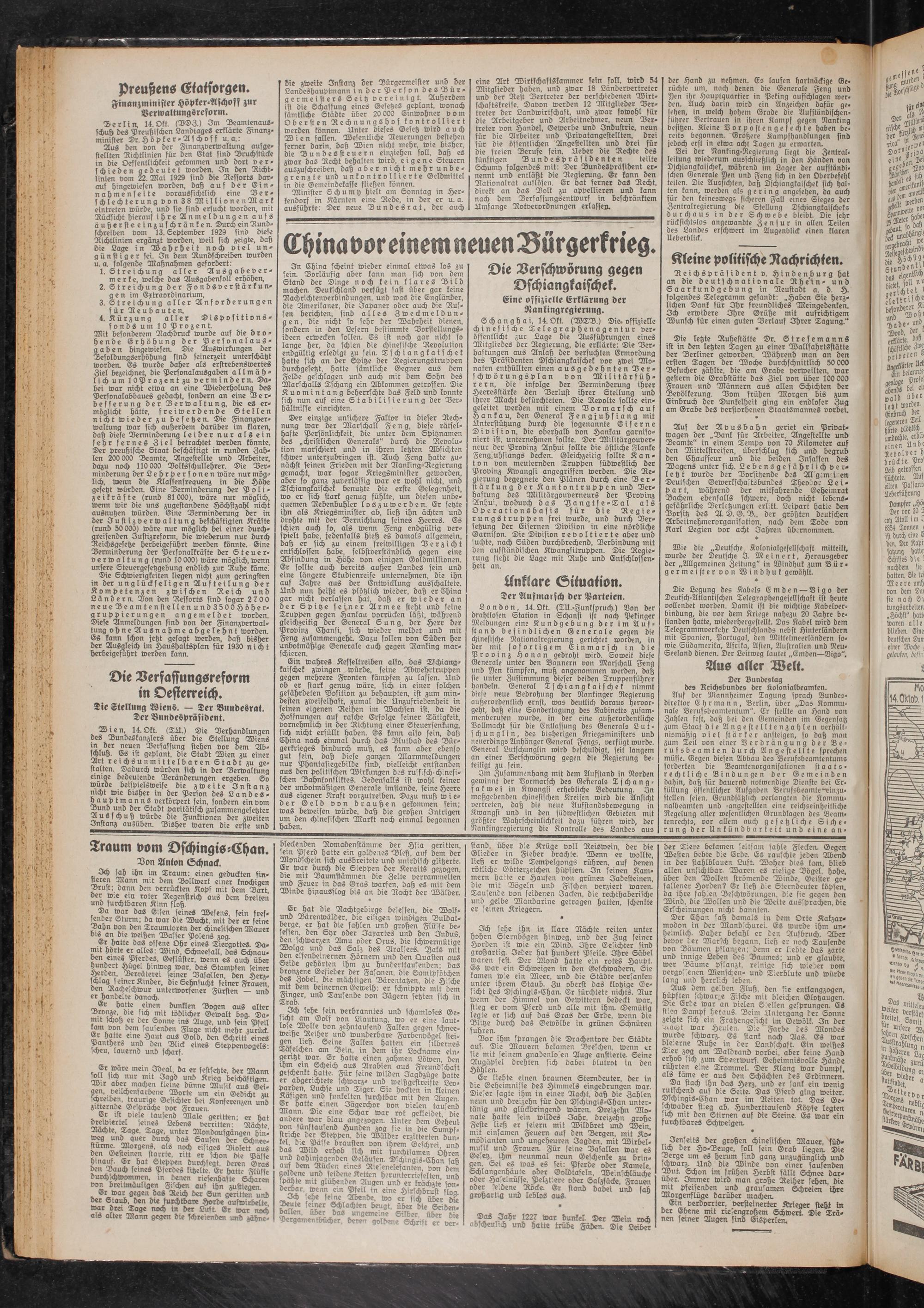 Derlin, 14.Ott. ((VDZ.) 3m Deamtenaus- schuh des Preußischen Landtages erklärte Finanz- Minister Dr.Höpker-Asch off u. a.: