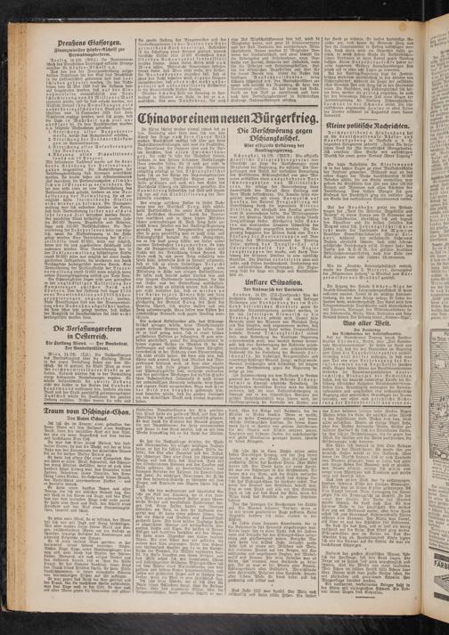 Bei der Nanking-Negierung liegt die Zentral- leitung wiederum ausschließlich in den Händen von Dschiangkaischek, während im Lager der aufständischen Generale Pen und Feng sich in den Oberbefehl teilen. Die Aussichten, daß Dschiangkaischek sich halten kann, werden als gering angesehen, da auch für den keineswegs sicheren Fall eines Sieges der Zentralregierung die Stellung Dschiangkaischeks durchaus in der Schwebe bleibt. Die sehr rücksichtslos angewandte Zensur in allen Teilen des Landes erschwert im Augenblick einen klaren Ueberblick.