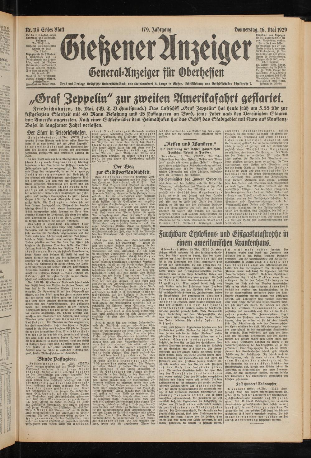 Friedrichshafen, 16. Mai. (W. T. B.-Kunkspruch.) Das Luftschiff „Graf Zeppelin" hat heute früh um 5.58 Uhr zur festgesetzten Startzeit mit 40 Mann Besatzung und 18 Passagieren an Bord, seine Fahrt nach den Vereinigten Staaten von Amerika angetreten. Rach einer Schleife über dem Heimathafen hat das Schiff das Stadtgebiet mit Kurs auf Konstanz- Basel in langsamer Fahrt verlassen. ?