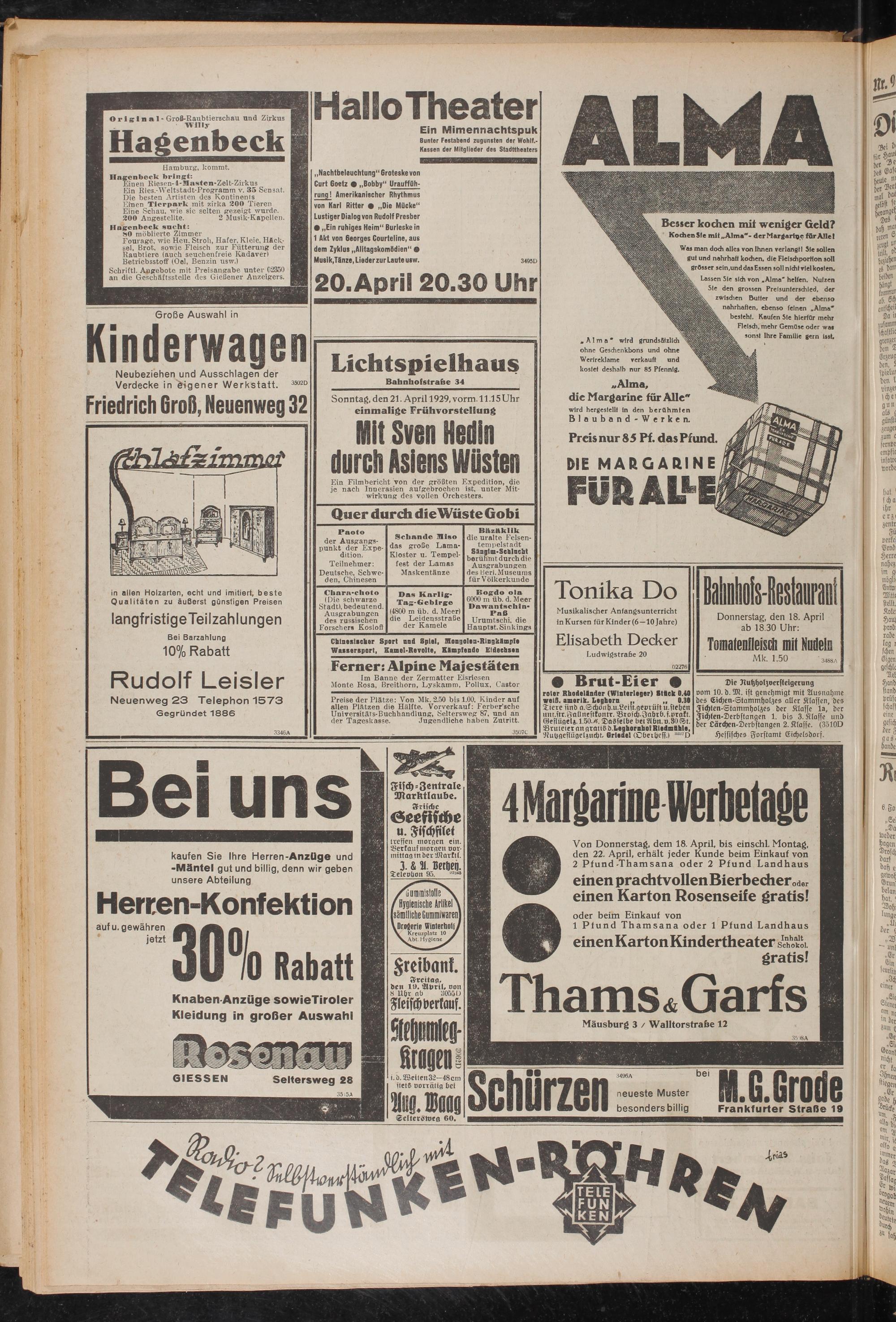 • Von Donnerstag, dem 18. April, bis einschl. Montag, den 22. April, erhält jeder Kunde beim Einkauf von 2 Pfund -Thamsana oder 2 Pfund Landhaus einen prachtvollen Bierbecheroder einen Karton Rosenseife gratis!
