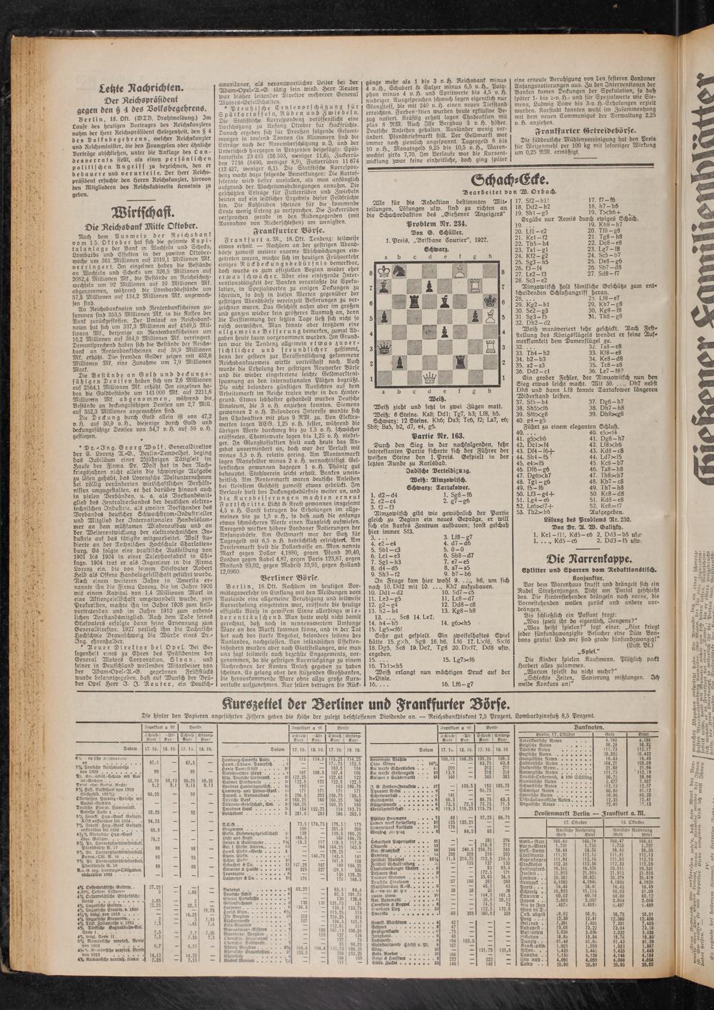 gänge mehr als 1 bis 3 v.H. Reichsbank minus 4 v.H.. Schubert & Salzer minus 6,5 v.H., Polyphän minus 4 v. H. und Spritwerte bis 4,5 v. H. niedriger. Ausgesprochen schwach lagen eigentlich nur Glanzslosf, die mit 240 v. H. einen neuen Tiefstand erreichten. Farben-ktien wurden heute exklusive Bezug notiert. Kräftig erholt lagen Chadeaktien mit plus 8 RM. Auch Ilse Bergbau 3 v.H. hoher. Deutsche Anleihen gehalten. Ausländer wenig verändert. Pfandbriefmarkt still. Der Geldmarkt war immer noch ziemlich angespannt. Tagesgeld 8 bis 10 v.H.. Monatsgeld 9,25 bis 10,5 v.H., Warenwechsel zirka 7,70. Im Verlaufe war die Kursentwicklung zwar keine einheitliche, doch ging später