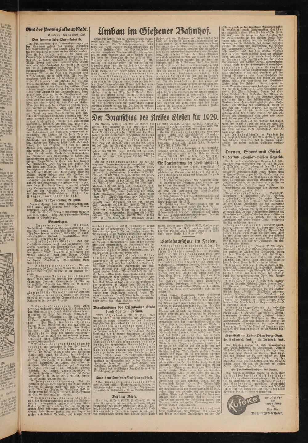 Die Kreisverwaltung des Kreises Gießen hat gestern den Mitgliedern des Kreistages den Voranschlag des Kreises Gießen für das Rechnungsjahr 1929 und die Einladung zu der diesjährigen ordentlichen Sitzung des Kreistages am 29. Iuni übermittelt.