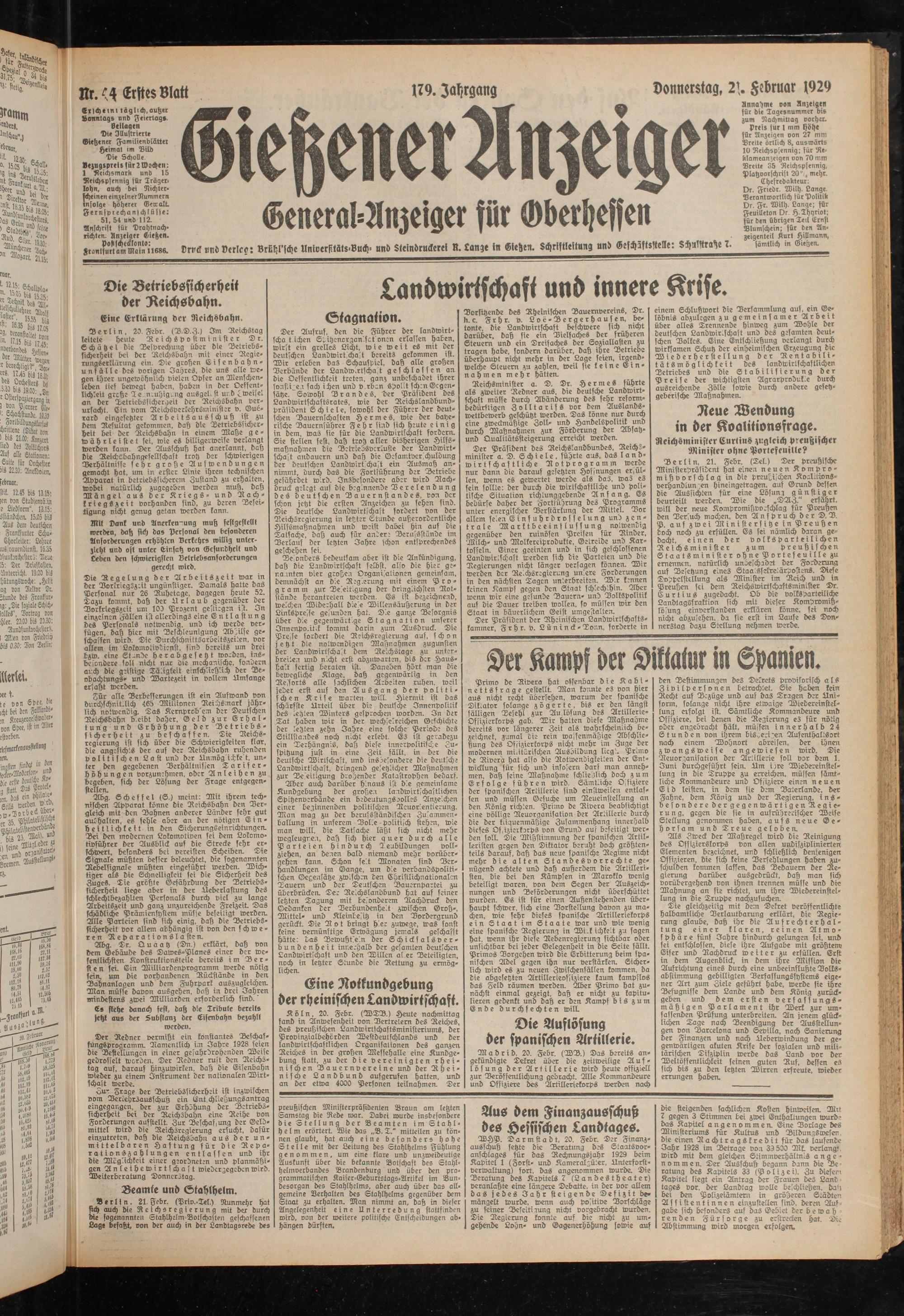 Dr. Friedr. Wilh. Lange Derantwortlich für Politik Dr. Fr. Wilh. Lange; für Feuilleton Dr H.THyriot; für den übrigen Ittl Ernst Dlumschein; für den An- zeigenteil Kurt Hillmann, sämtlich in Gießen.