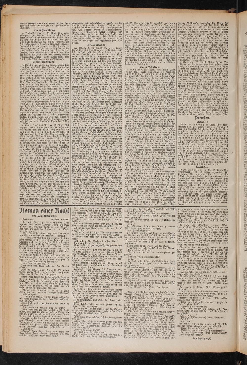 Eichelsdorf und Ober-Schmitten wurde ein die Straße überquerender junger Bursche von einem Motorrad erfaßt und hingeworfen. Der Fahrer landete im Chausseegraben, konnte aber später die Fahrt fortsetzen. Ein Schulmädchen wurde an derselben Stelle nur durch die Geistesgegenwart des Lenkers vom Lieberfahrenwerden bewahrt. Die Straße ist gerade an Sonntagen von Spaziergängern stark belebt.