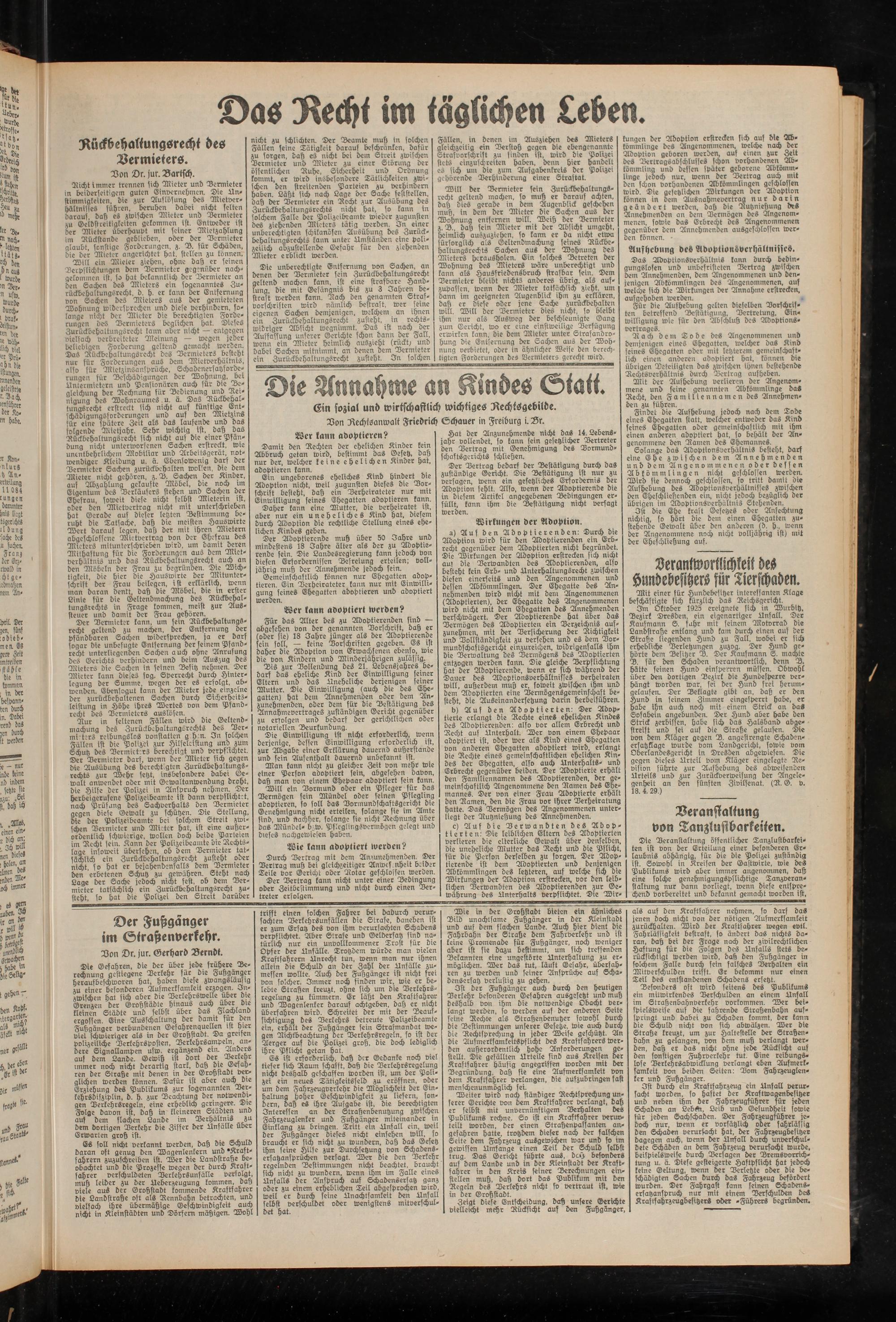 Im Oktober 1925 ereignete sich in Wurbitz, Bezirk Dresden, ein eigenartiger Unfall. Der Kaufmann S. fahr mit seinem Motorrad die Landstraße entlang und kam durch einen auf der Straße liegenden Hund zu Fall, wobei et sich erhebliche Verletzungen zuzog. Der Hund gehörte dem Besitzer B. Der Kaufmann S. machte B. für den Schaden verantwortlich, denn B. hätte seinen Hund einsperren müssen. Obwohl über den dortigen Bezirk die Hundesperre verhängt worden war, sei der Hund frei herumgelaufen. Der Beklagte gibt an, daß er den Hund in seinem Zimmer eingesperrt habe, er habe ihn auch noch mit einem Strick an das Sofabein angebunden. Der Hund aber habe den Strick zerbissen, habe sich das Halsband abgestreift und sei auf die Straße gelaufen. Die von dem Kläger gegen D. angestrengte Schadenersatzklage wurde vom Landgericht, sowie vom Oberlandesgericht in Dresden abgewiesen. Die gegen dieses Urteil vom Kläger eingelegte Revision führte zur Aufhebung des abweisenden Urteils und zur Zurückverweisung der Angelegenheit an den fünften Zivilsenat. (D. G. v. 18. 4. 29.)